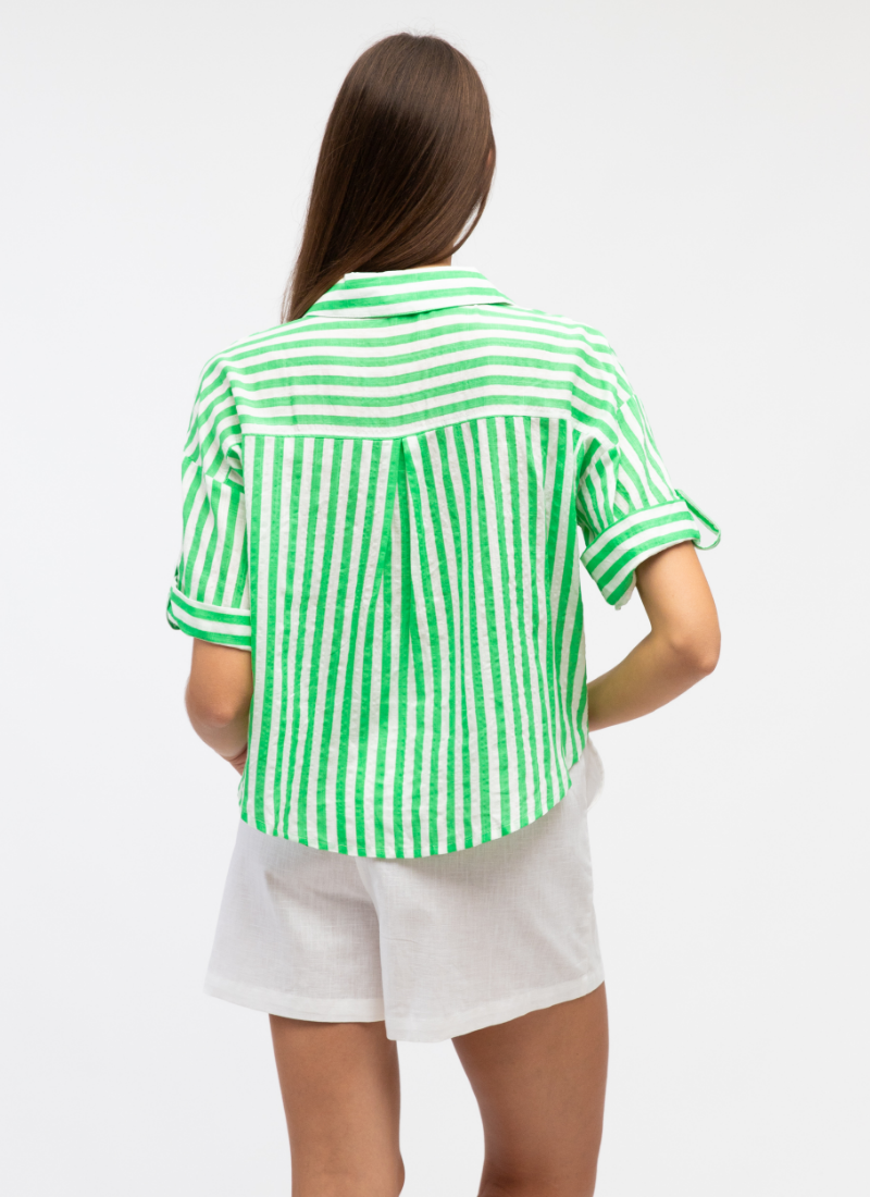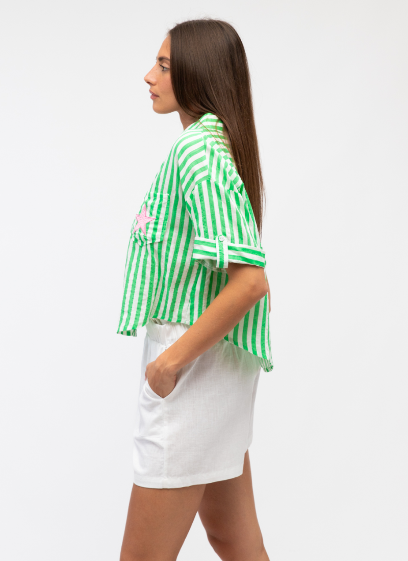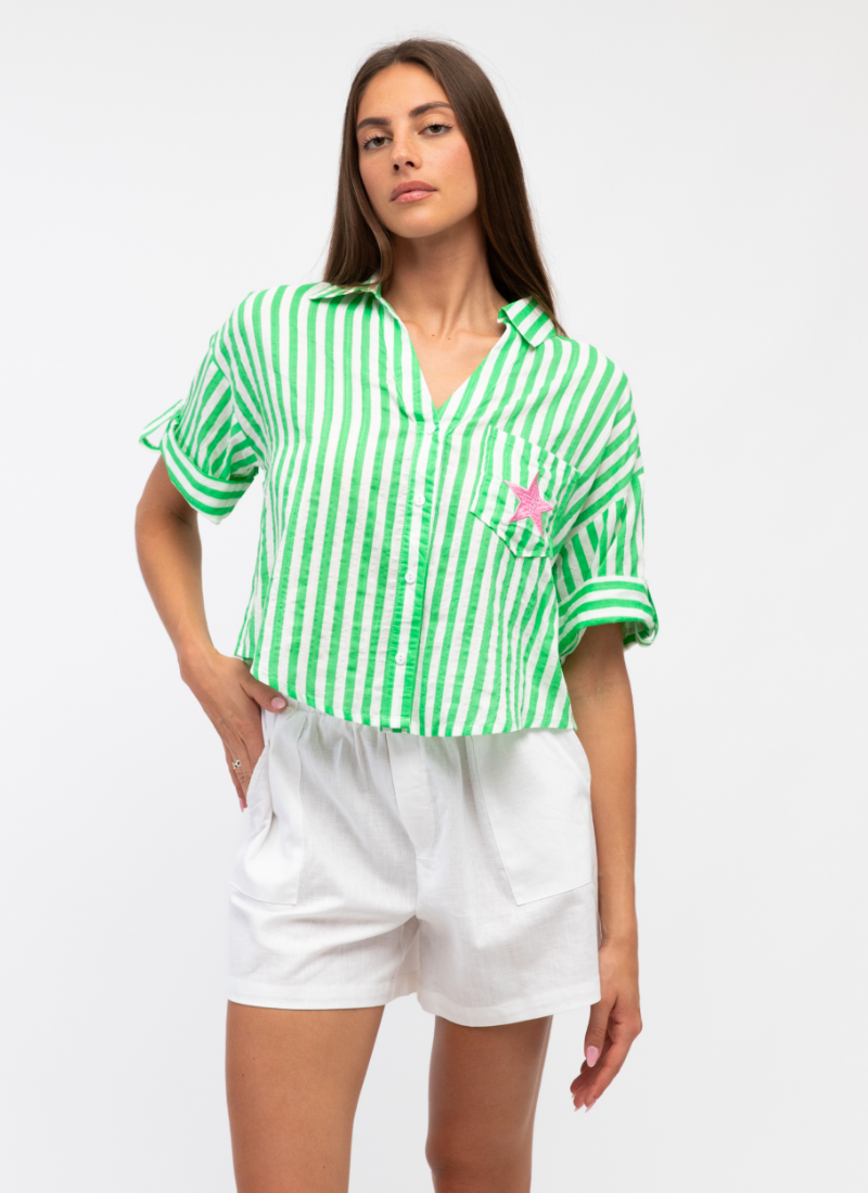 Introducing the Striped Star shirt Green from Label of Love. This breezy lemon-striped shirt brings playful polish to warm-weather wardrobes.