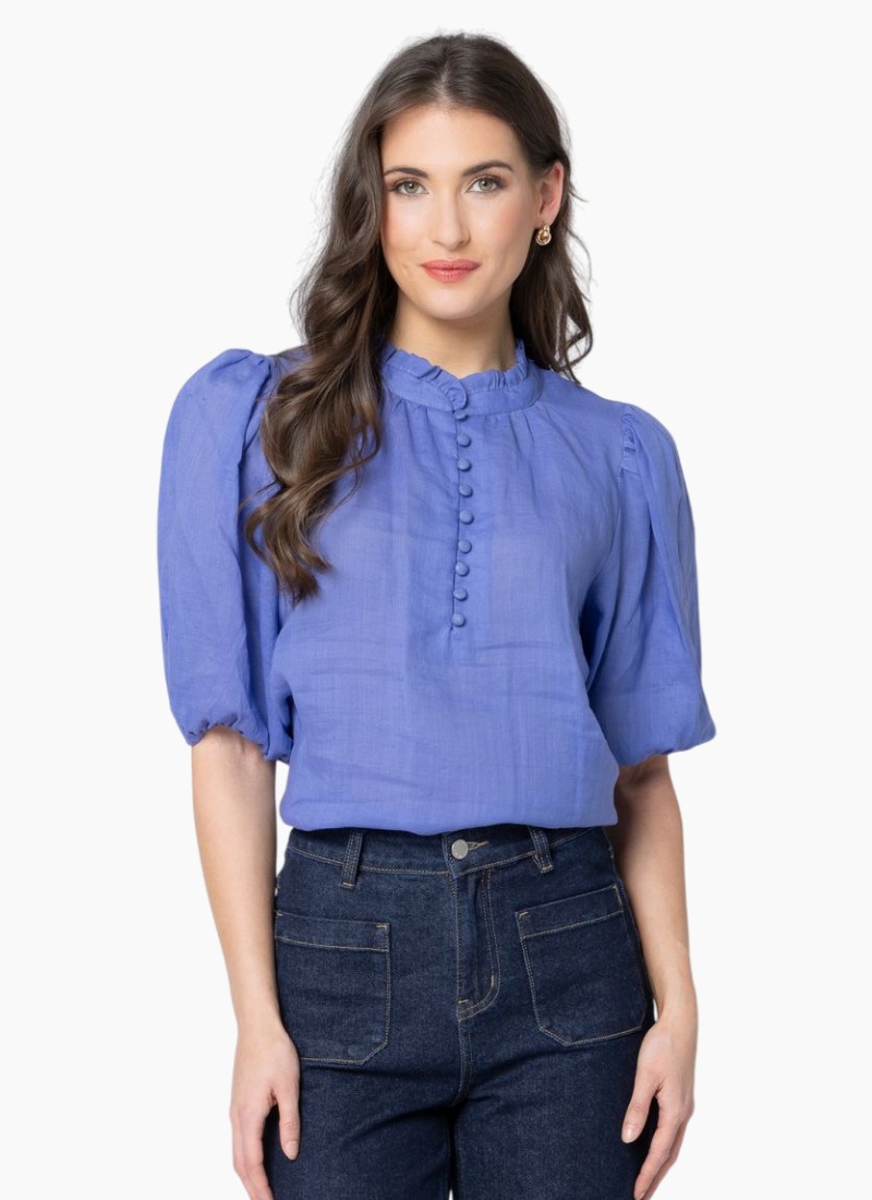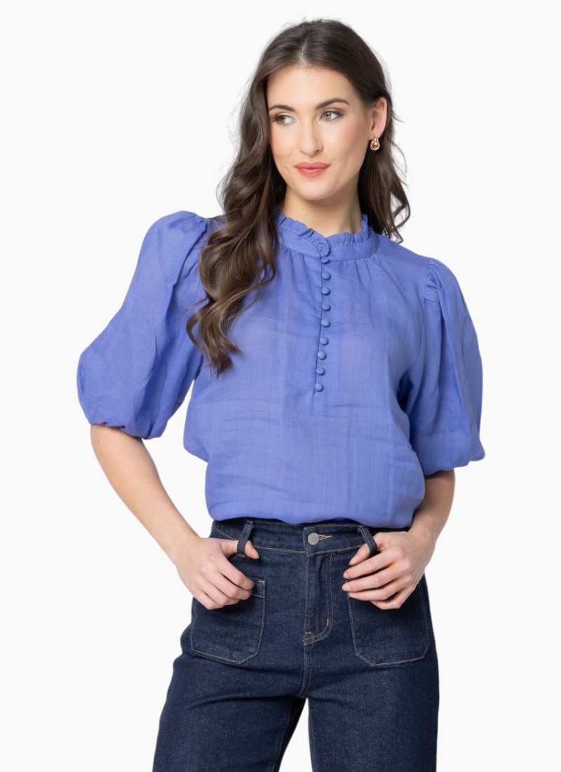 The Leila + Luca Royal Nina Blouse is all about quiet polish. Made from a lightweight fabric with a soft sheen, it features covered buttons, puff sleeves, and a subtle frill neckline. Tuck it into denim or tailored pants for an effortlessly put-together look.Garment Features Button placket front Crew neck Elasticated cuffs No stretch Standard fit Content: 100% Ramie