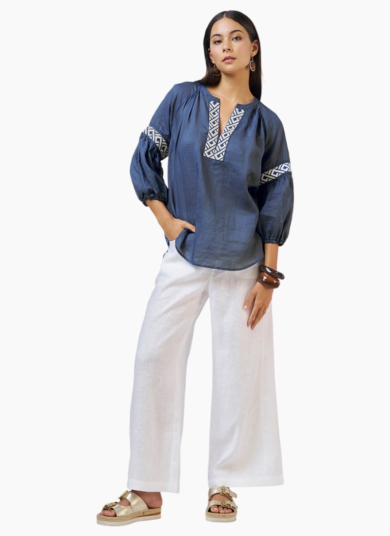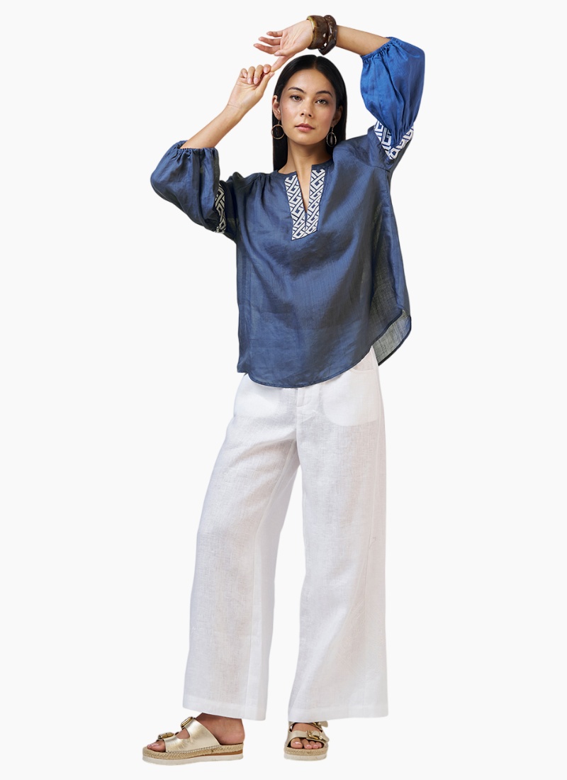 Ramie blouse with a V-neckline, featuring contrast embroidery detail around neckline and sleeve panels. Sleeves gather into a turned back elasticated cuff. LS3176