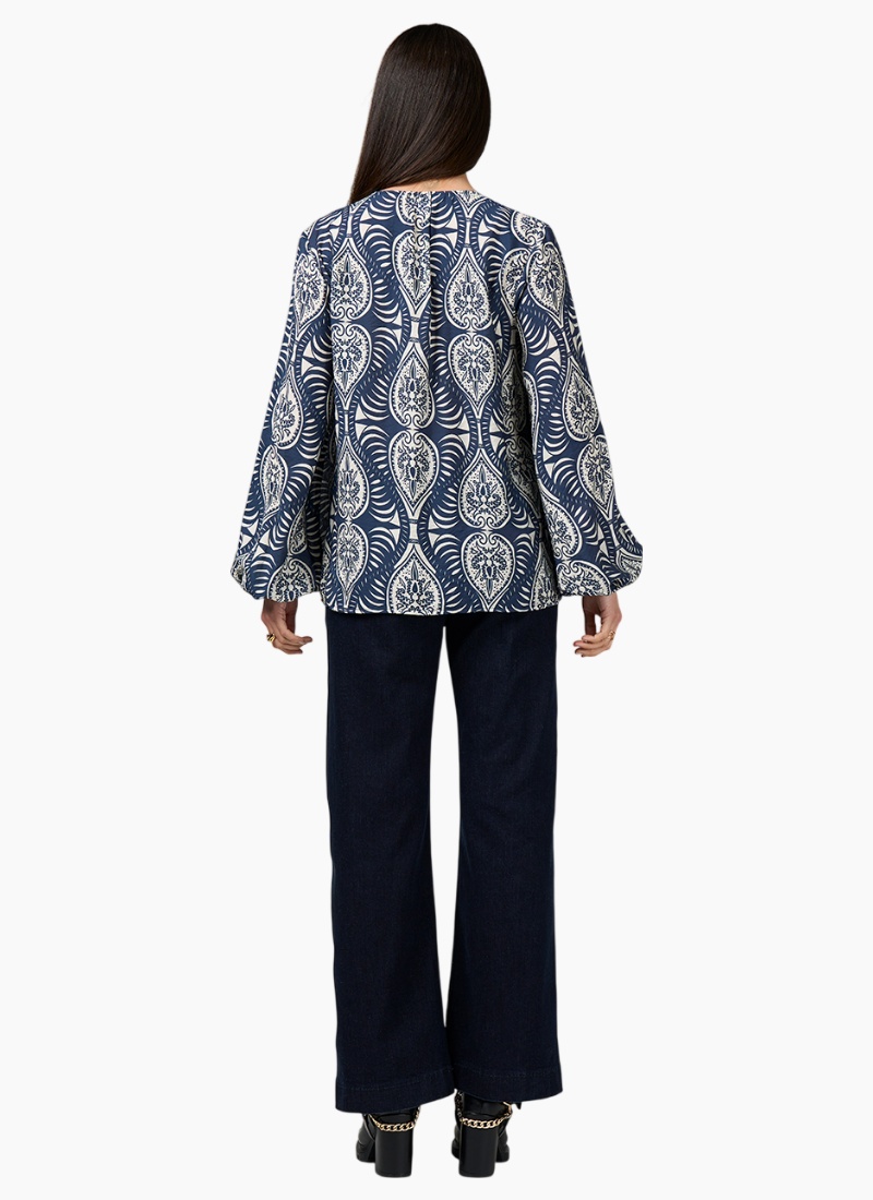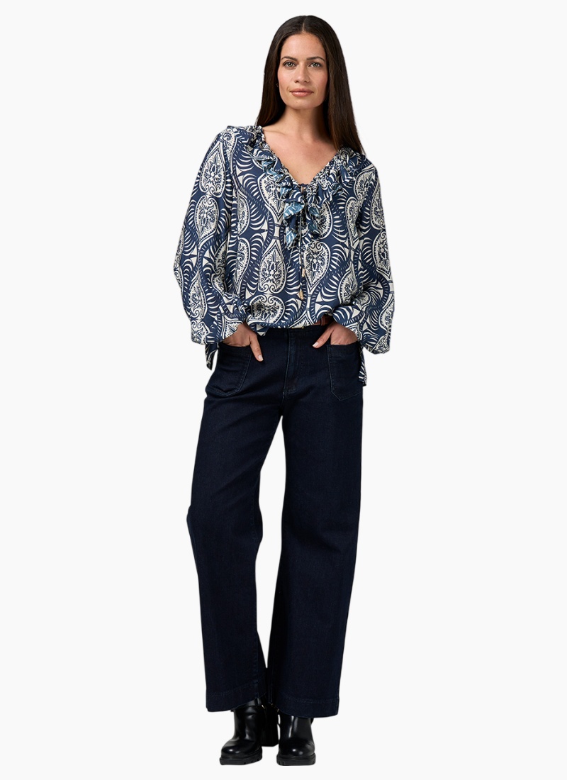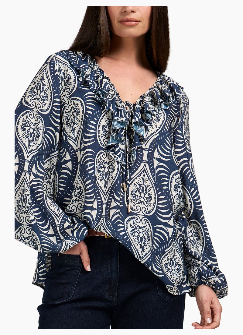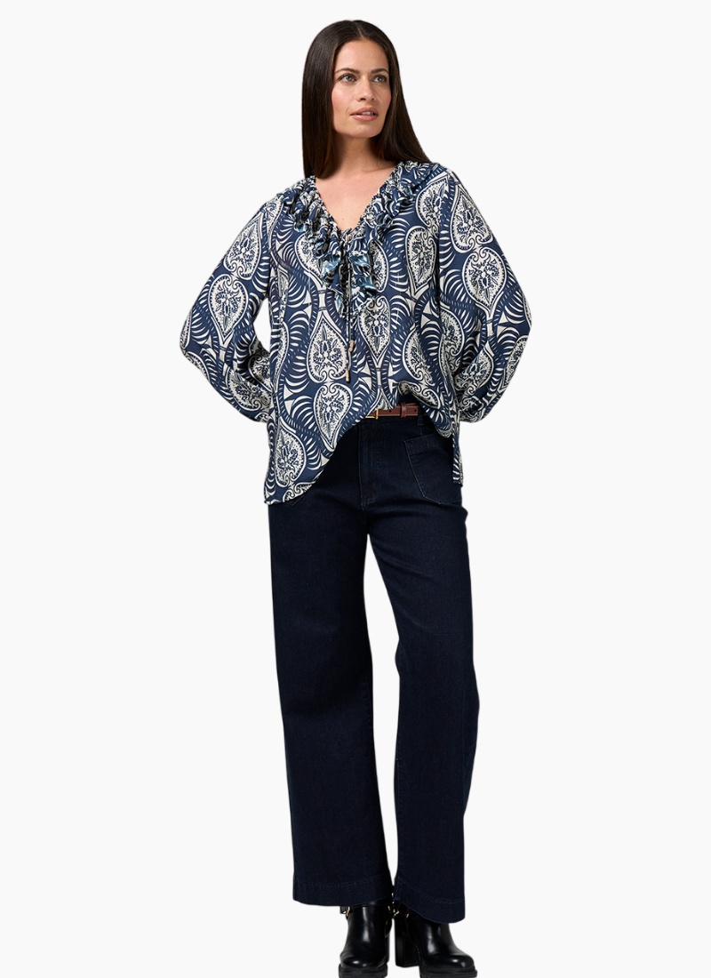 Floaty blouse featuring a deep V-neckline with delicate front ruffles, secured by a hook-and-eye and tie detail, with voluminous blouson sleeves and soft elasticated cuffs.