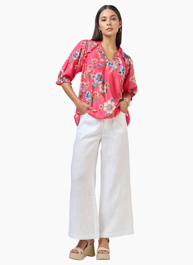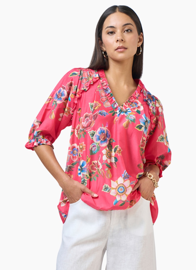 Introducing the Zinnia Top from Loobies Story. This vibrant coral floral blouse brings effortless, feminine style to your wardrobe as a standout Tops piece.