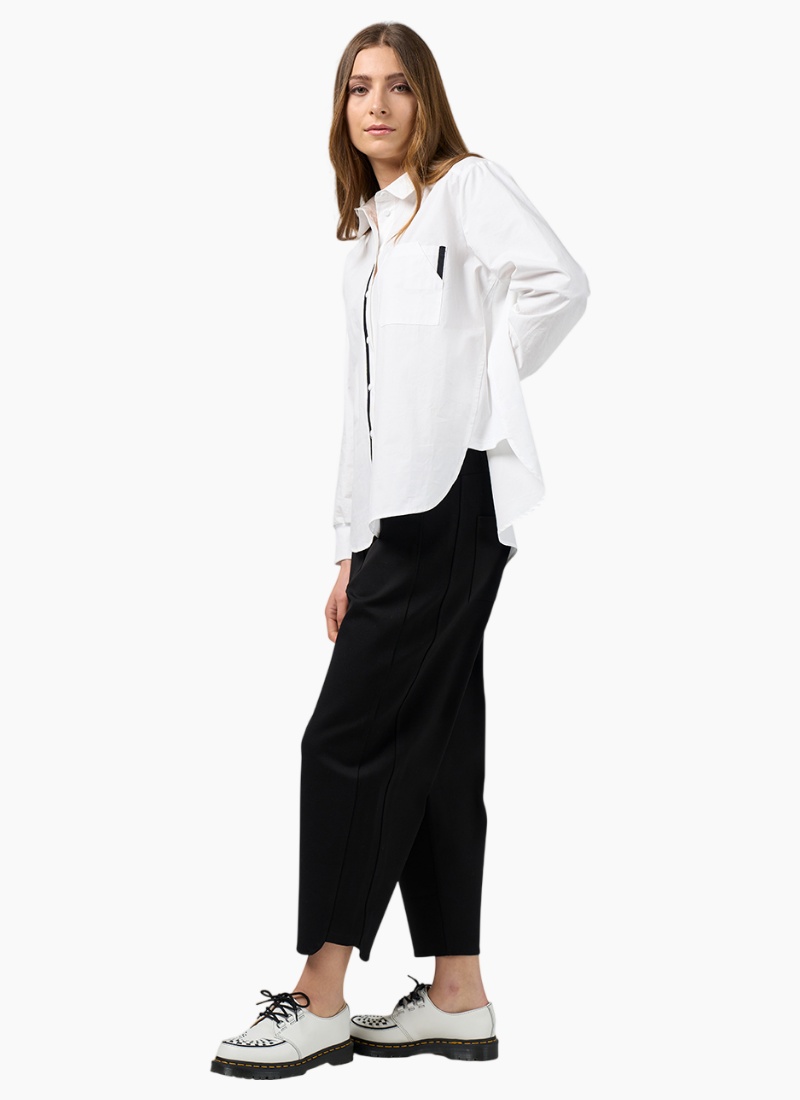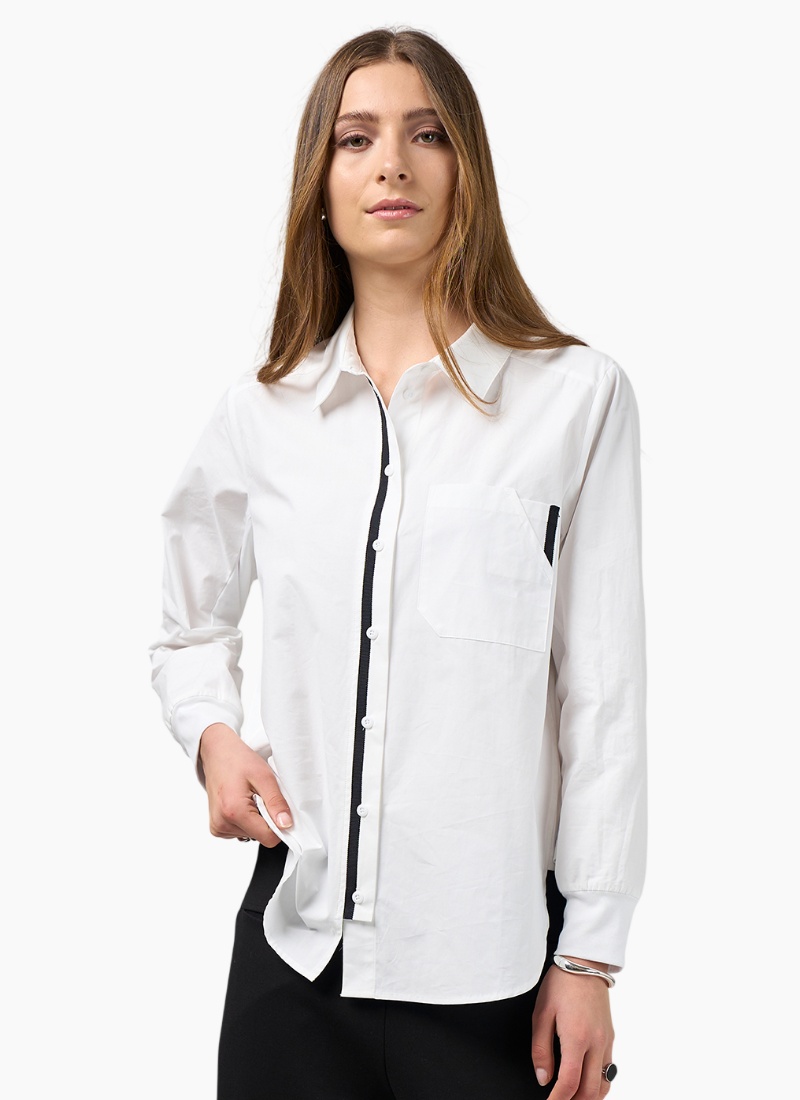 Button-through collared shirt with curved shirt tails, and ribbed cuffs, featuring contrast tape detail highlighting the front button stand and on the cut-away pocket detail.