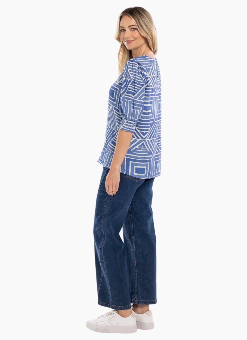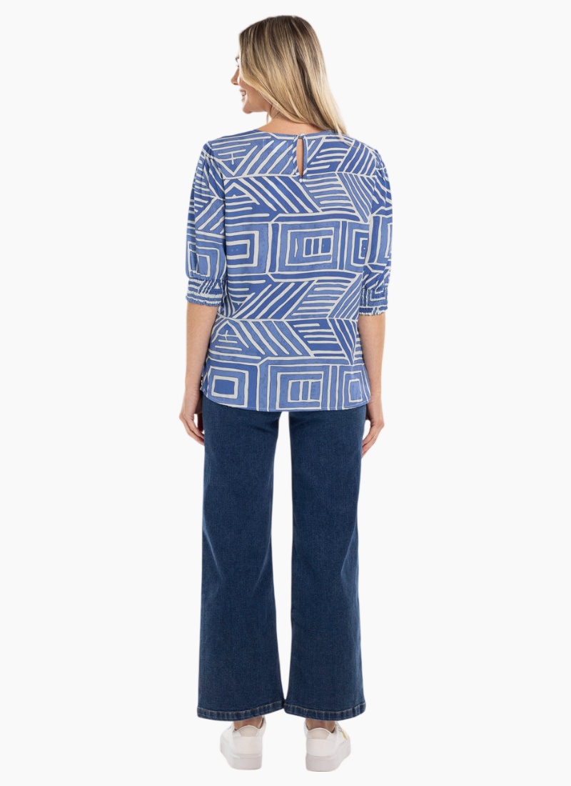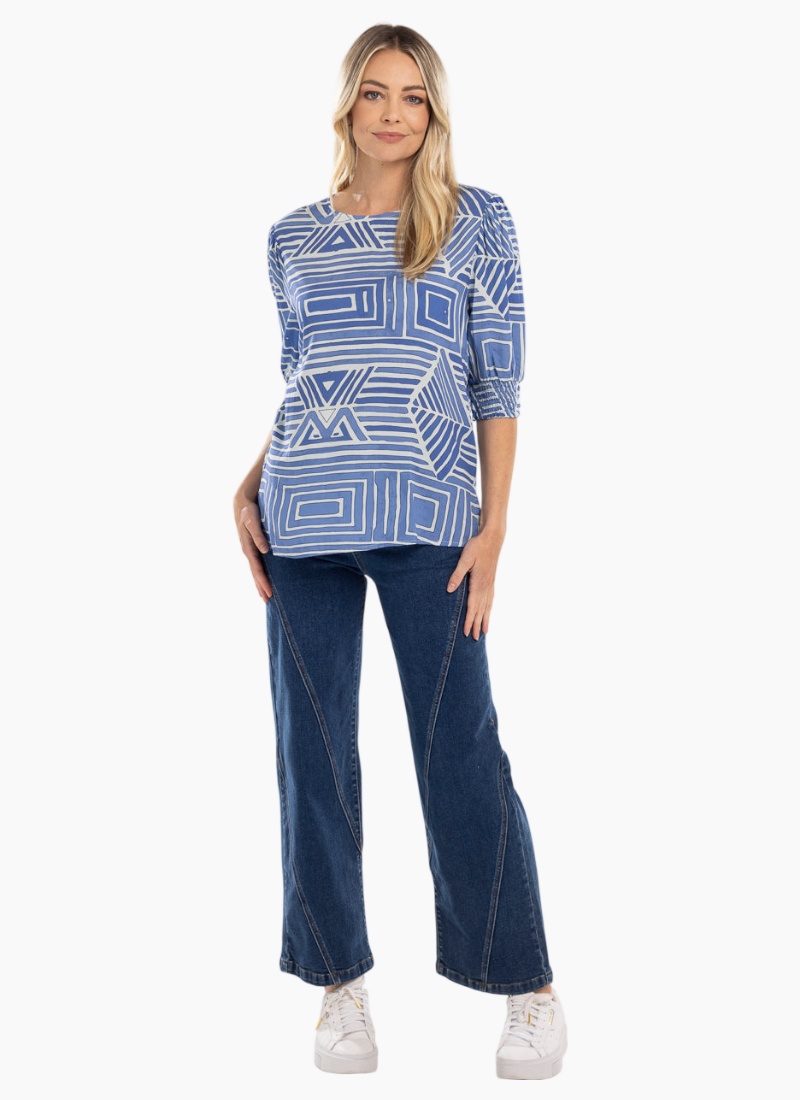 - Bold blue-and-white geometric print adds contemporary interest and elevates casual outfits