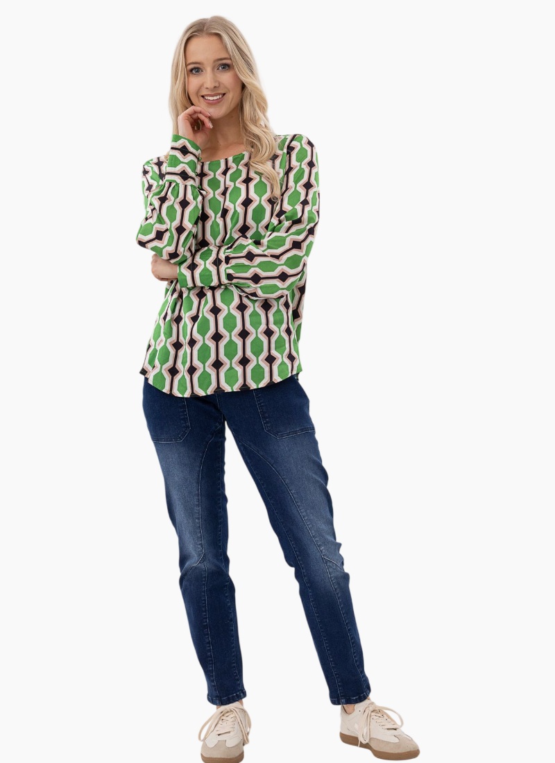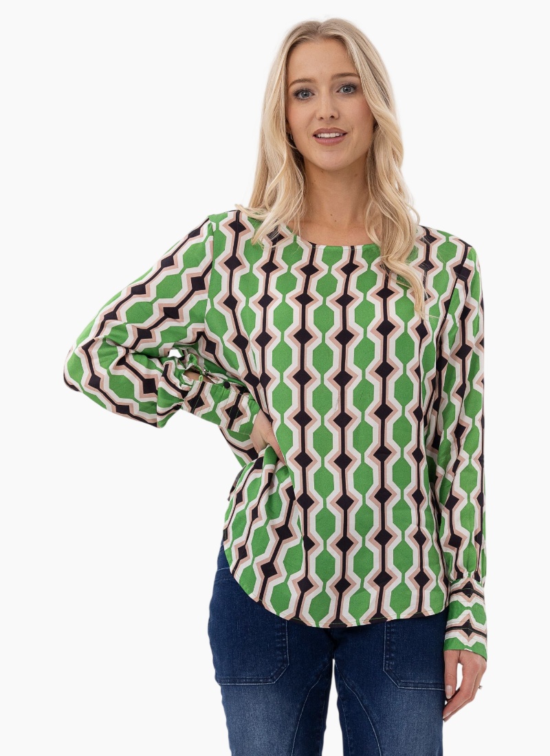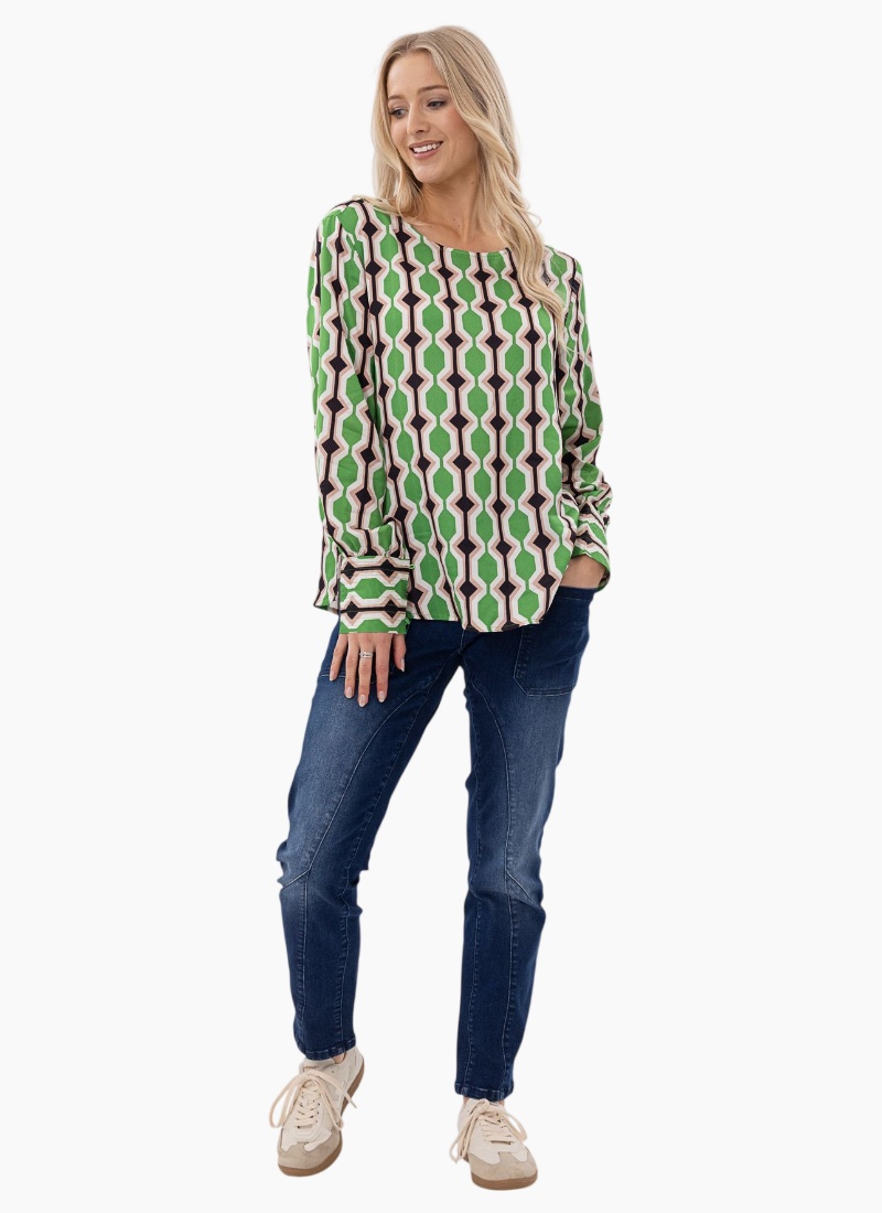 - Bold green, cream and black geometric print gives a retro-modern statement while remaining effortlessly wearable