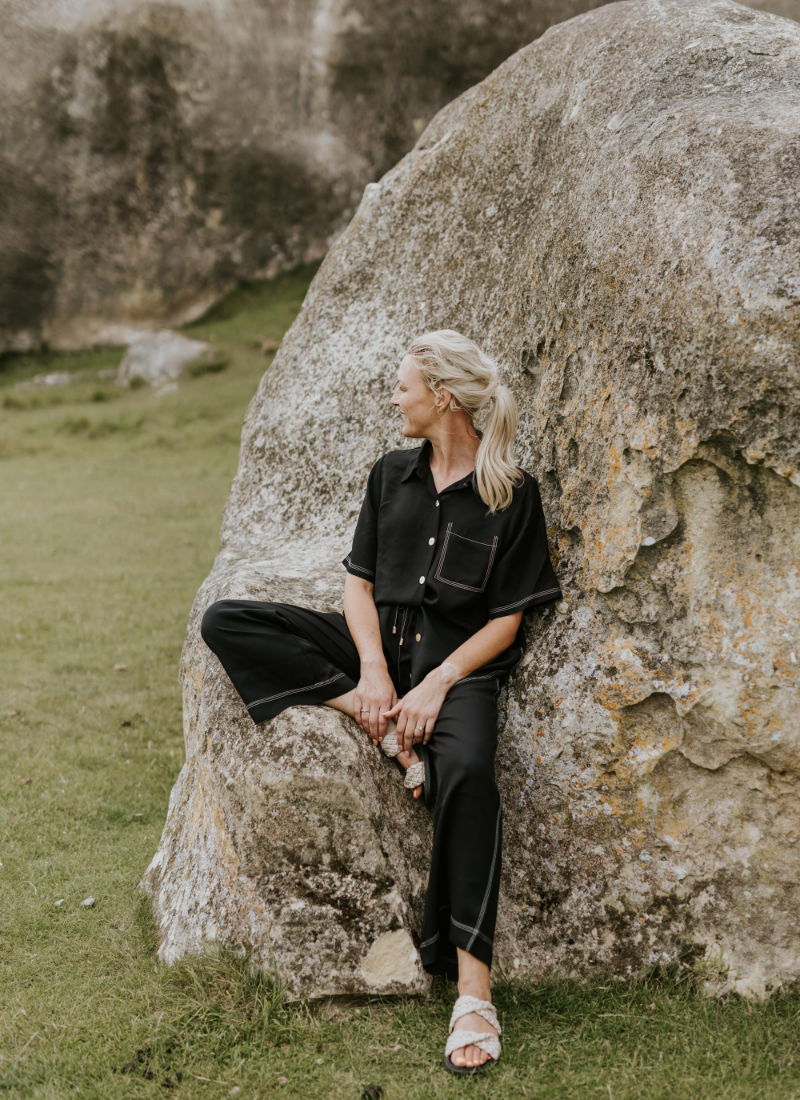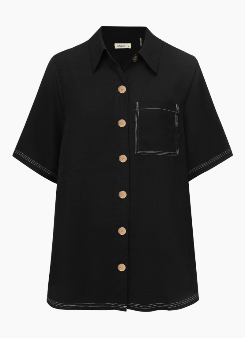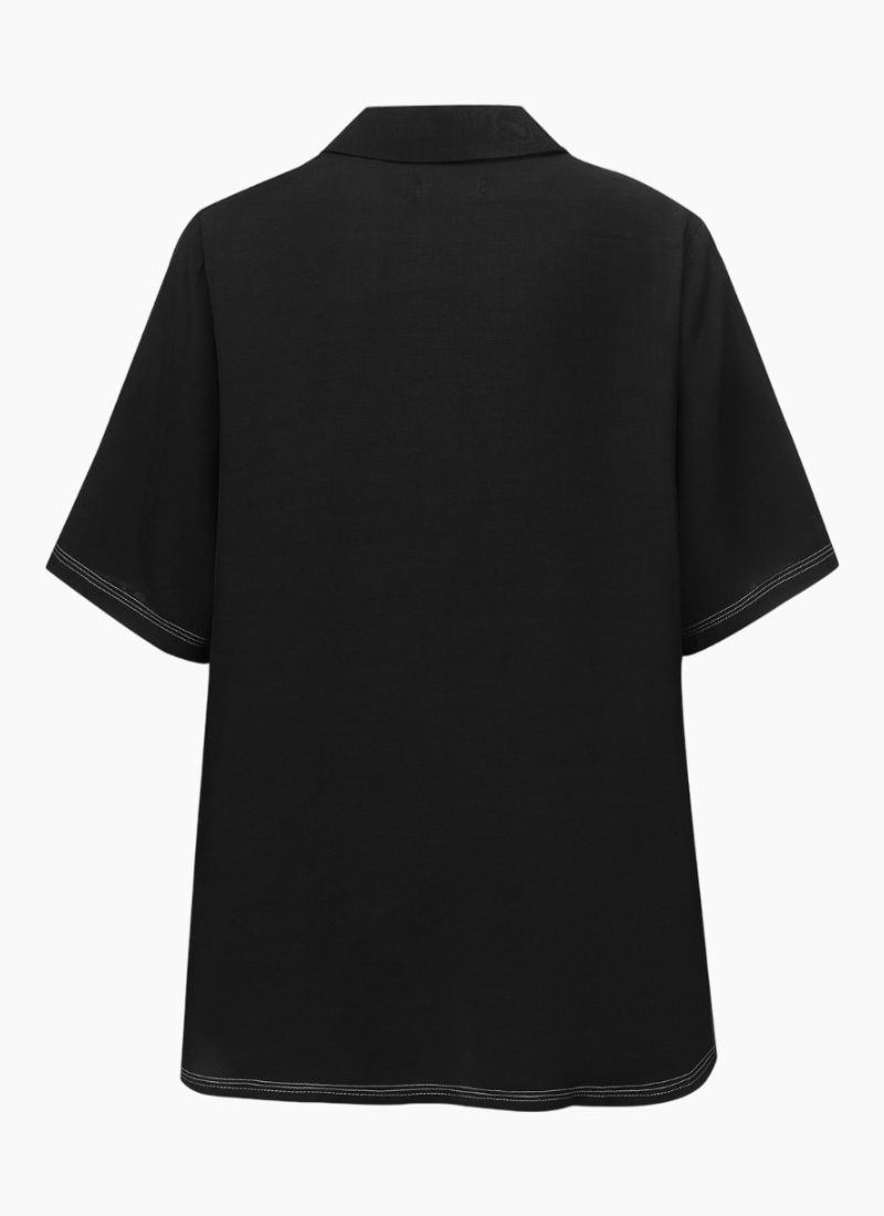 Introducing the MISSY SHIRT from Moke. This refined black shirt brings a modern, relaxed silhouette with subtle contrast topstitching.
