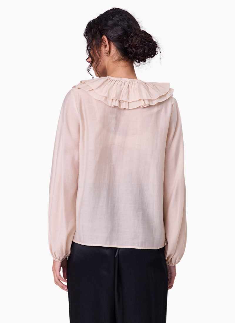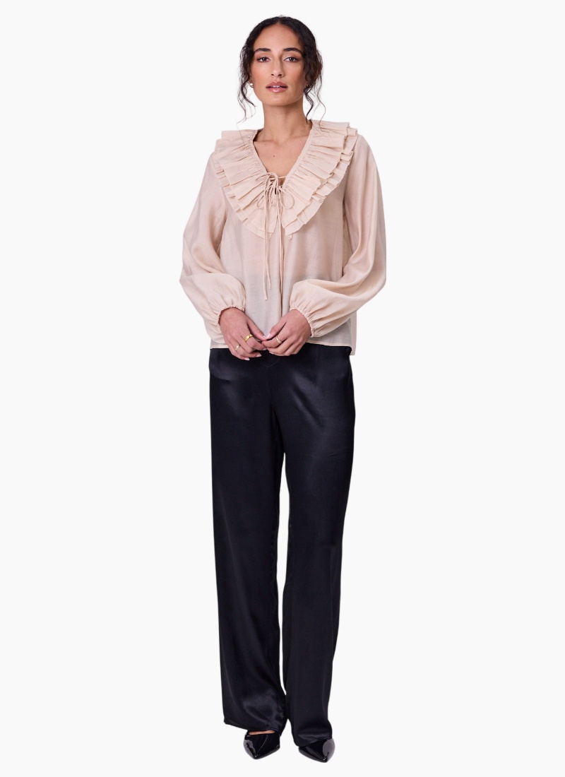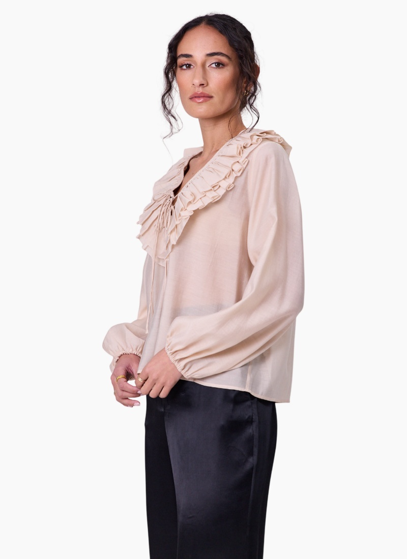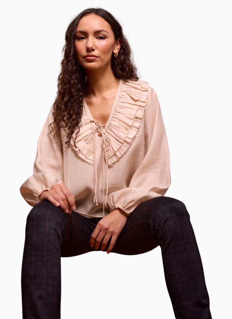 - Champagne from Navy & Co. This softly draping champagne blouse features a feminine ruffled V-neck and gentle, billowed sleeves — an elegant piece for both day and evening.