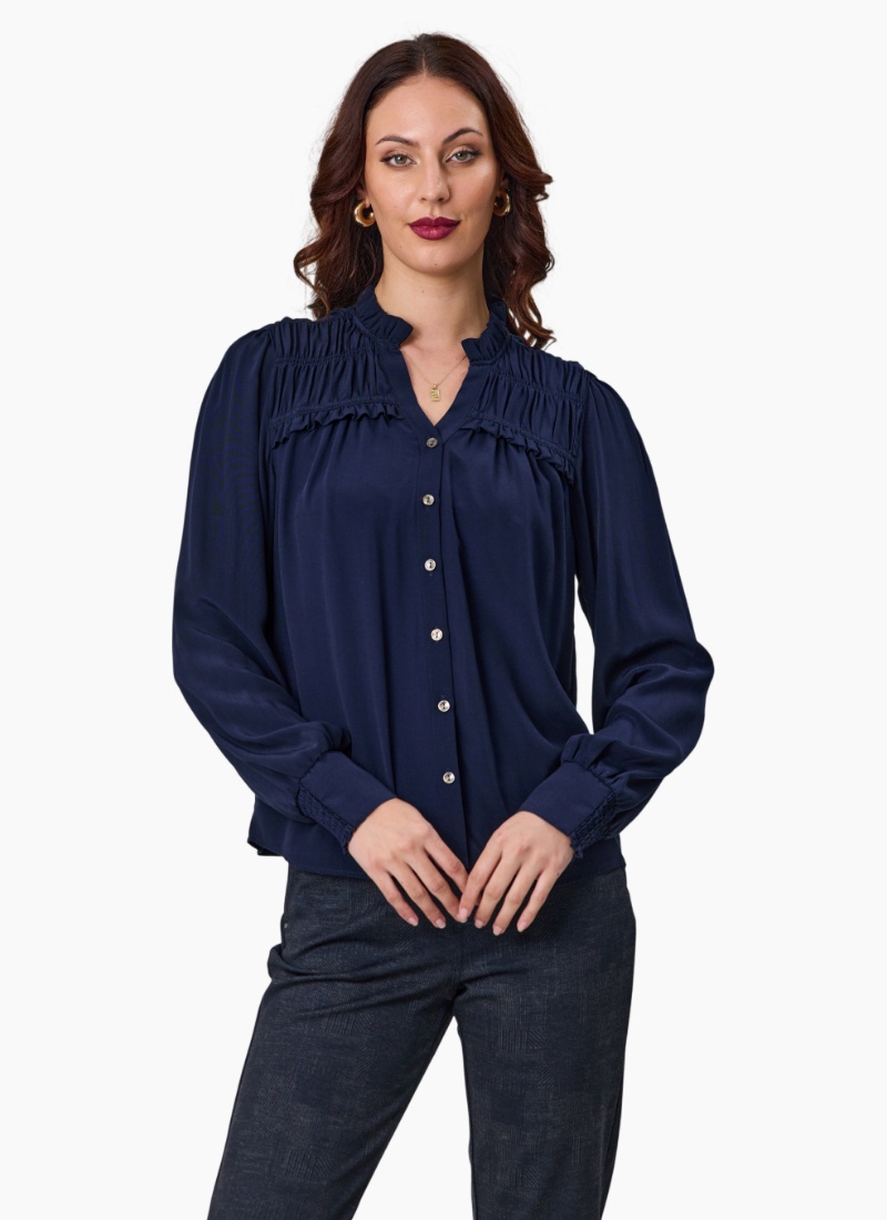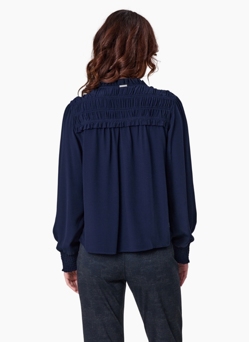 - Features a ruffled mock collar and shirred yoke detailing for romantic texture