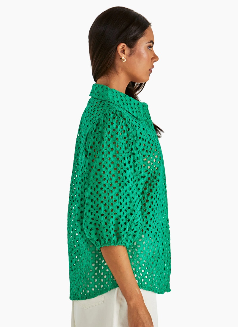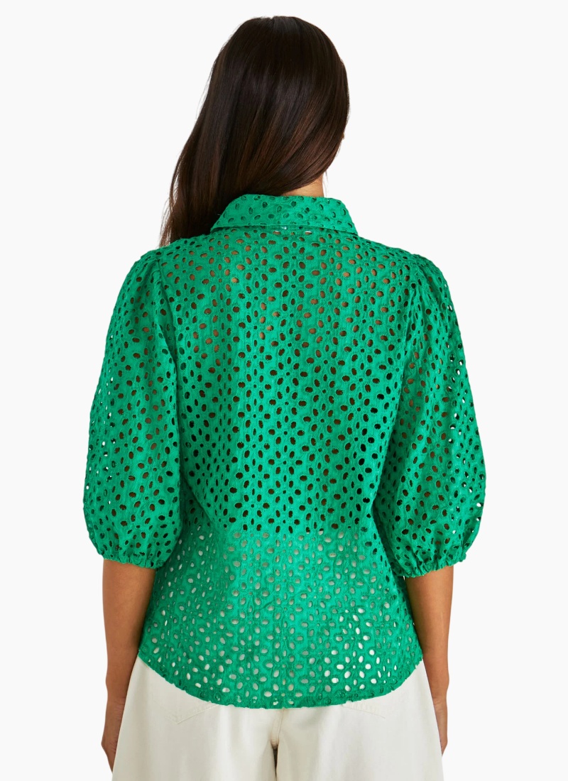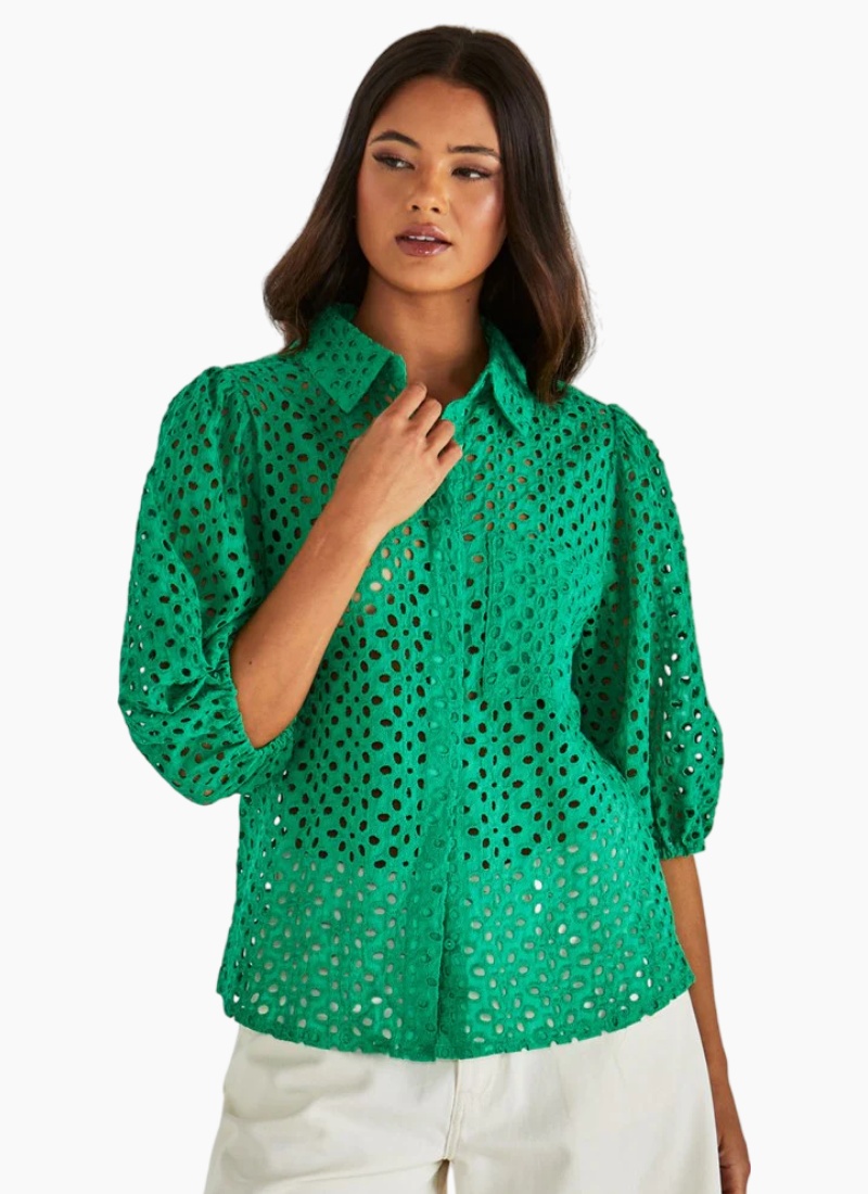 The Steva Shirt brings all the charm with broderie details and a puff sleeve. It’s unlined and lightweight—perfect for keeping things cool while still looking elevated. Throw it on with denim for instant style.