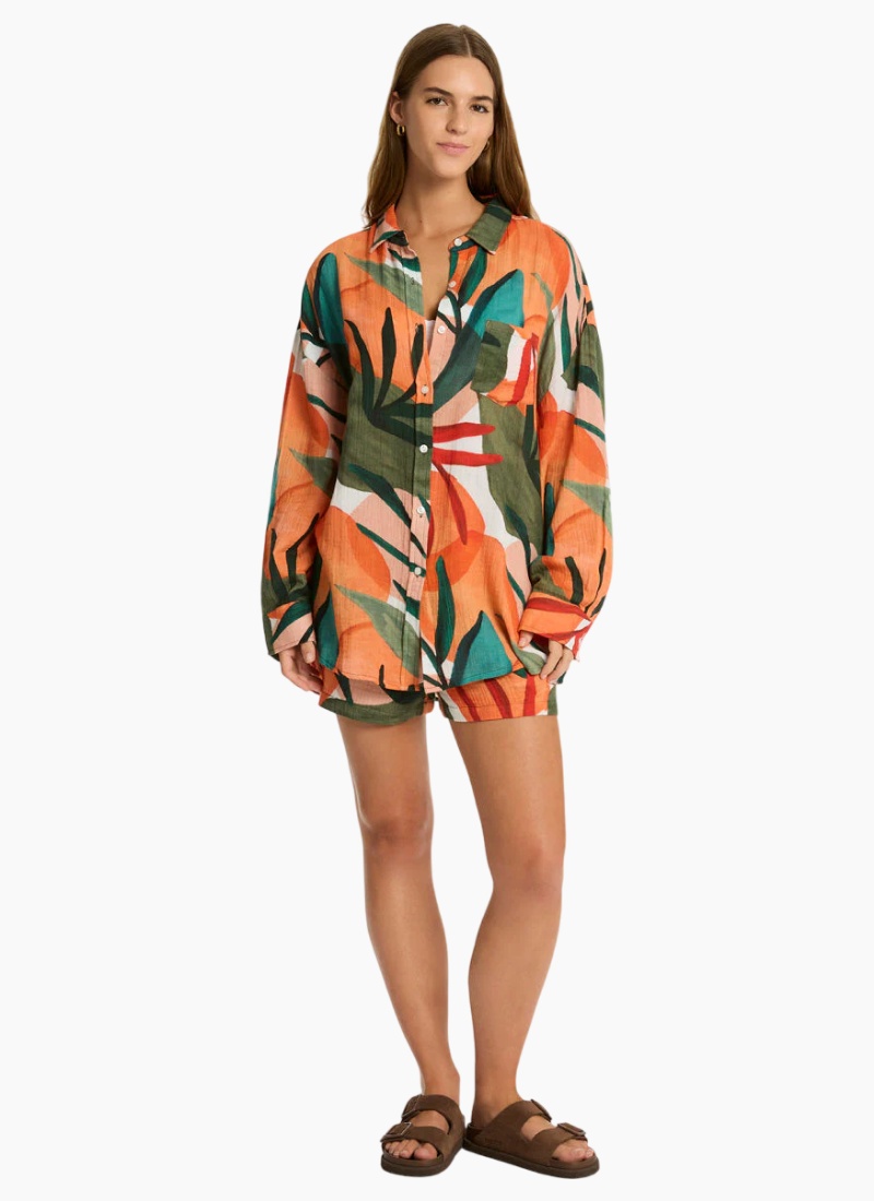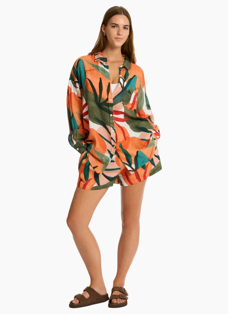 Introducing the Tropaluxe Beach Shirt from Sea Level. This breezy beach shirt brings vibrant tropical colour and relaxed coastal charm to your summer wardrobe.