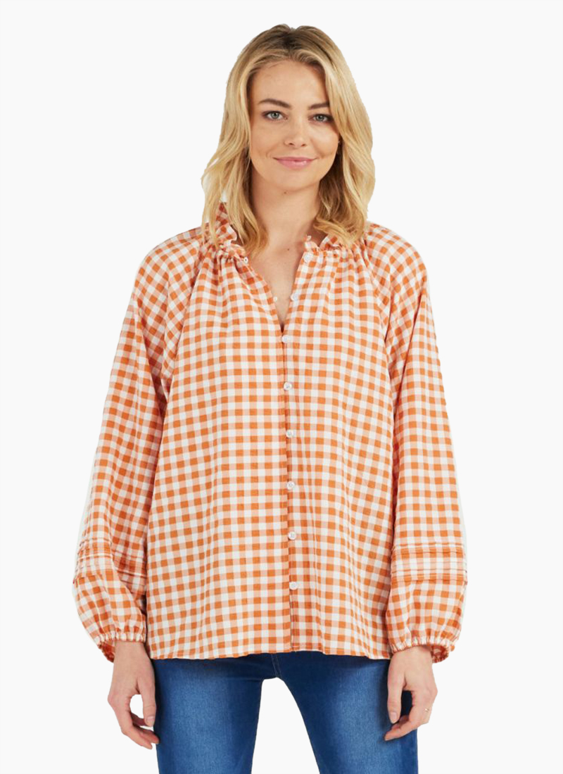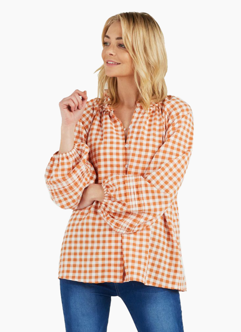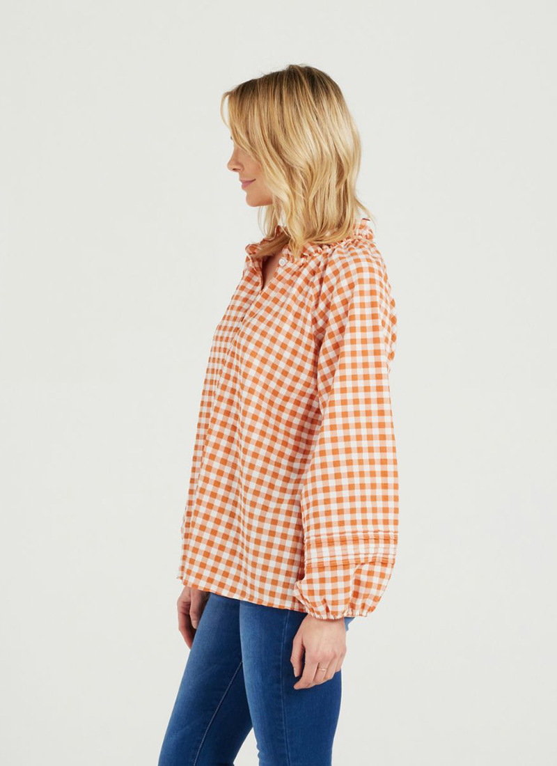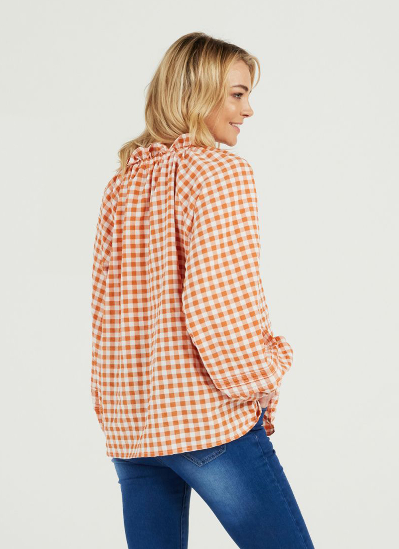 long sleeve v neck shirt with gathered neckline in orange check print