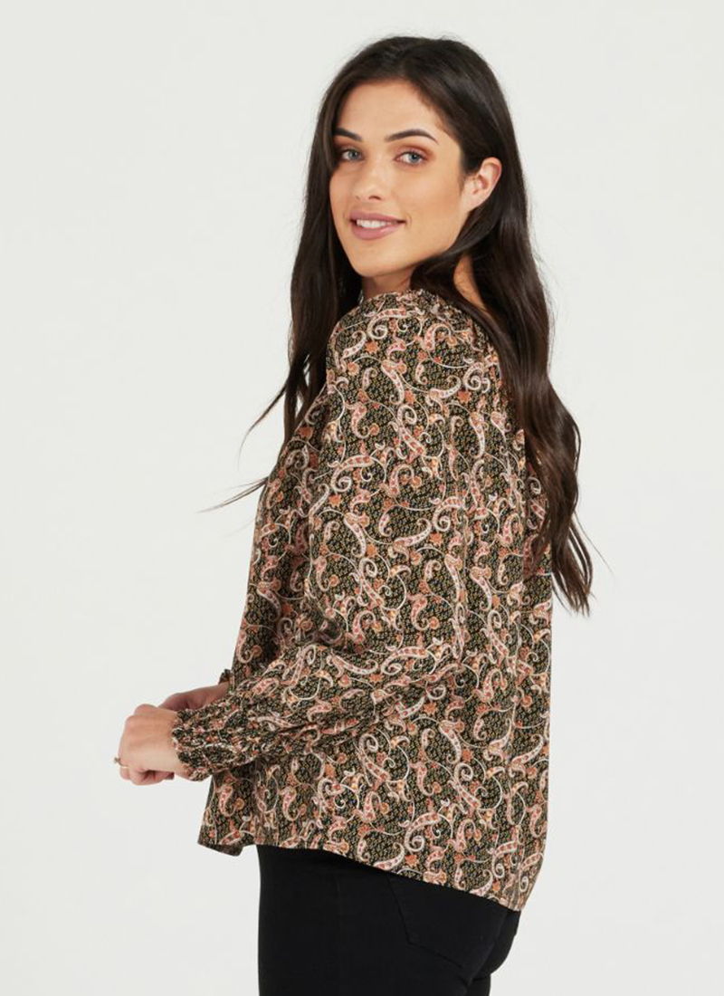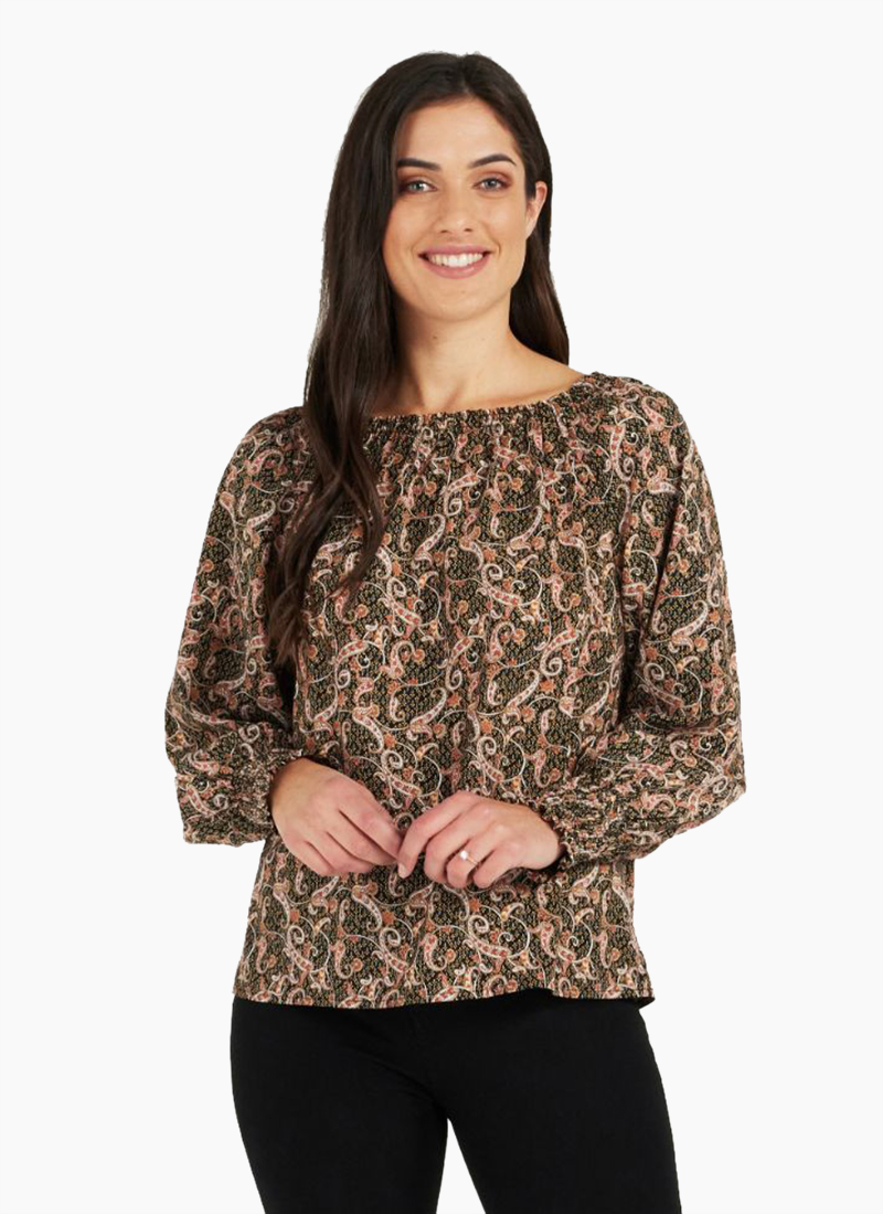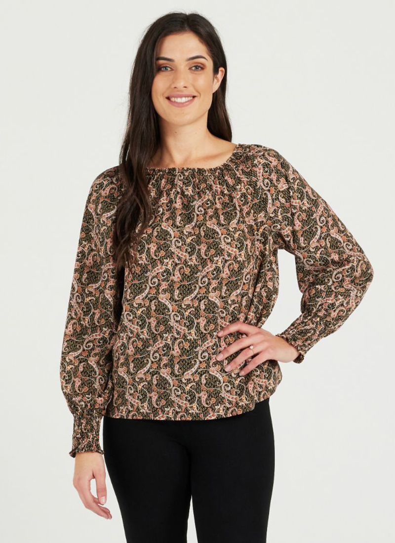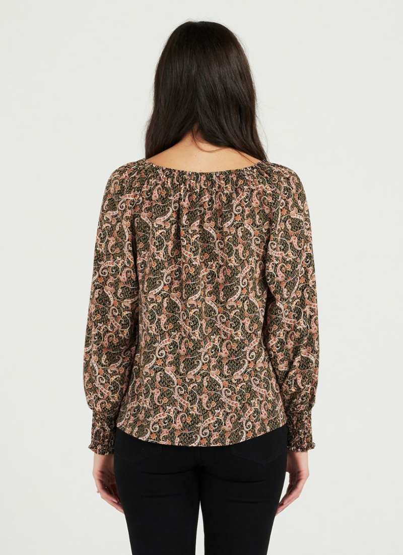 long sleeve top with shirring around the neckline area in paisley print