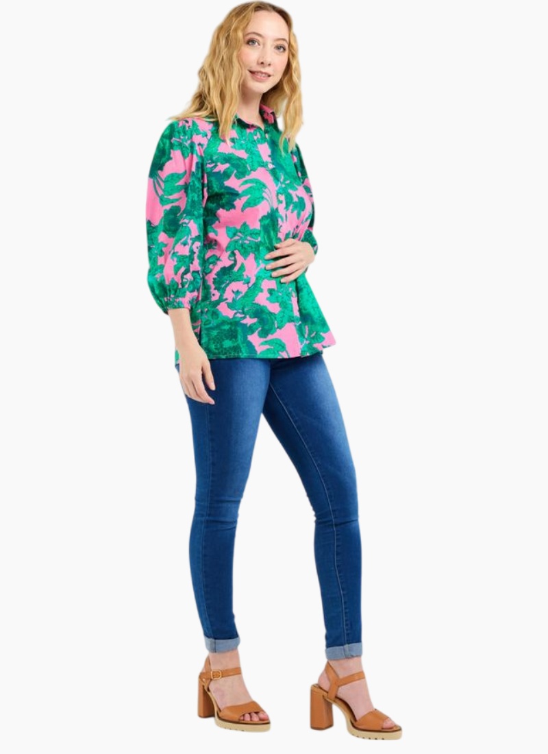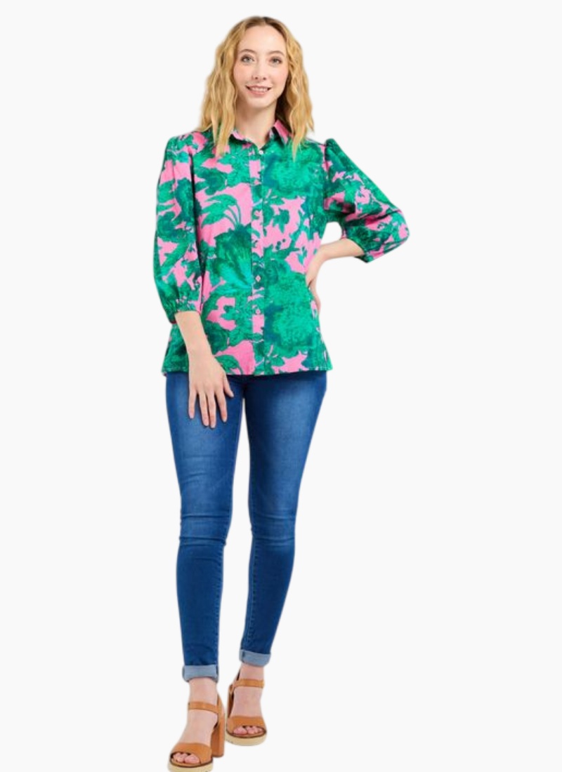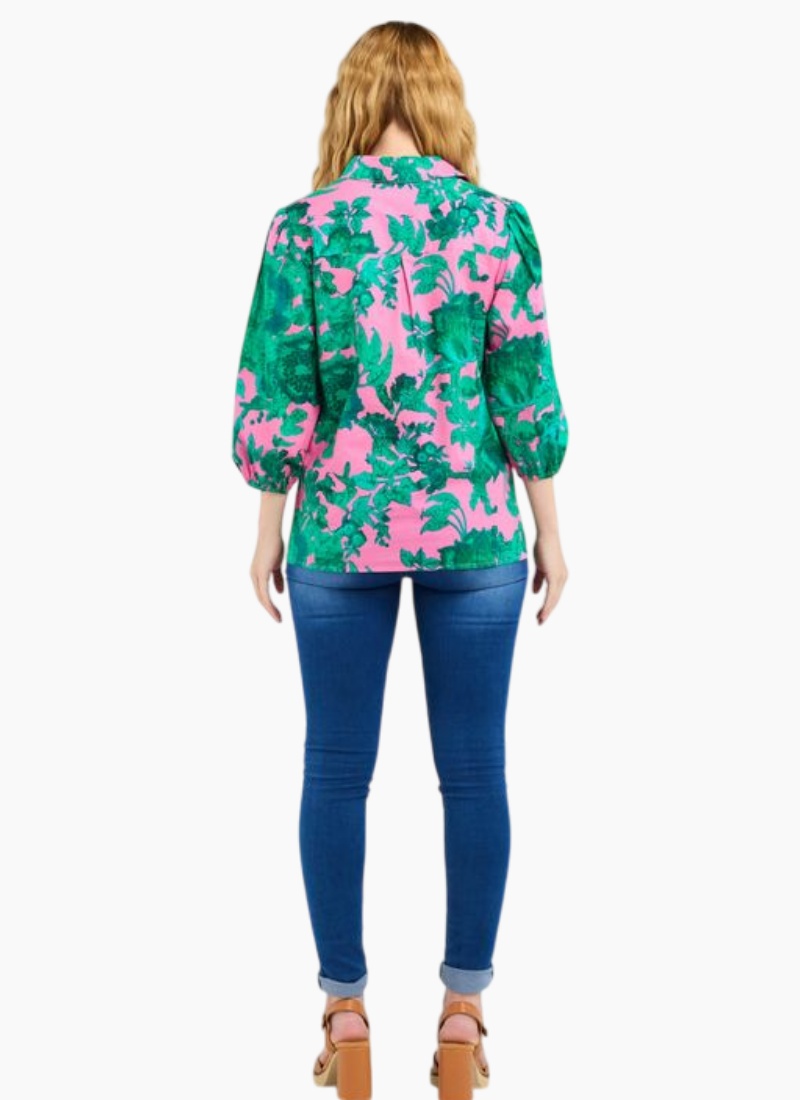 Introducing the vibrant JU;IETTE BLOUSE from Seduce. This eye-catching piece is perfect for adding a splash of colour to your wardrobe.This stylish shirt blends tailored structure with soft, feminine details. It features a front button closure, elegant 3/4-length blouse sleeves, and a flattering, easy fit. The design is set against a pink background, adorned with green botanical artwork that adds a fresh, nature-inspired touch. A versatile piece that balances classic shirting with artistic charm.