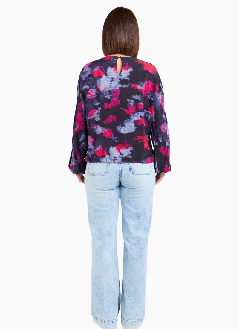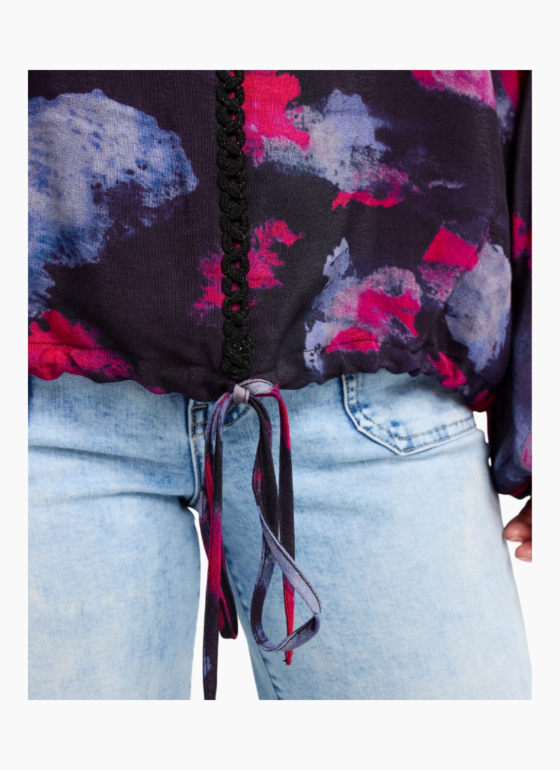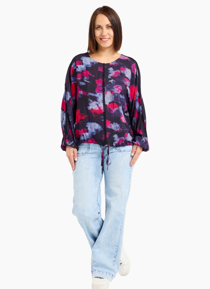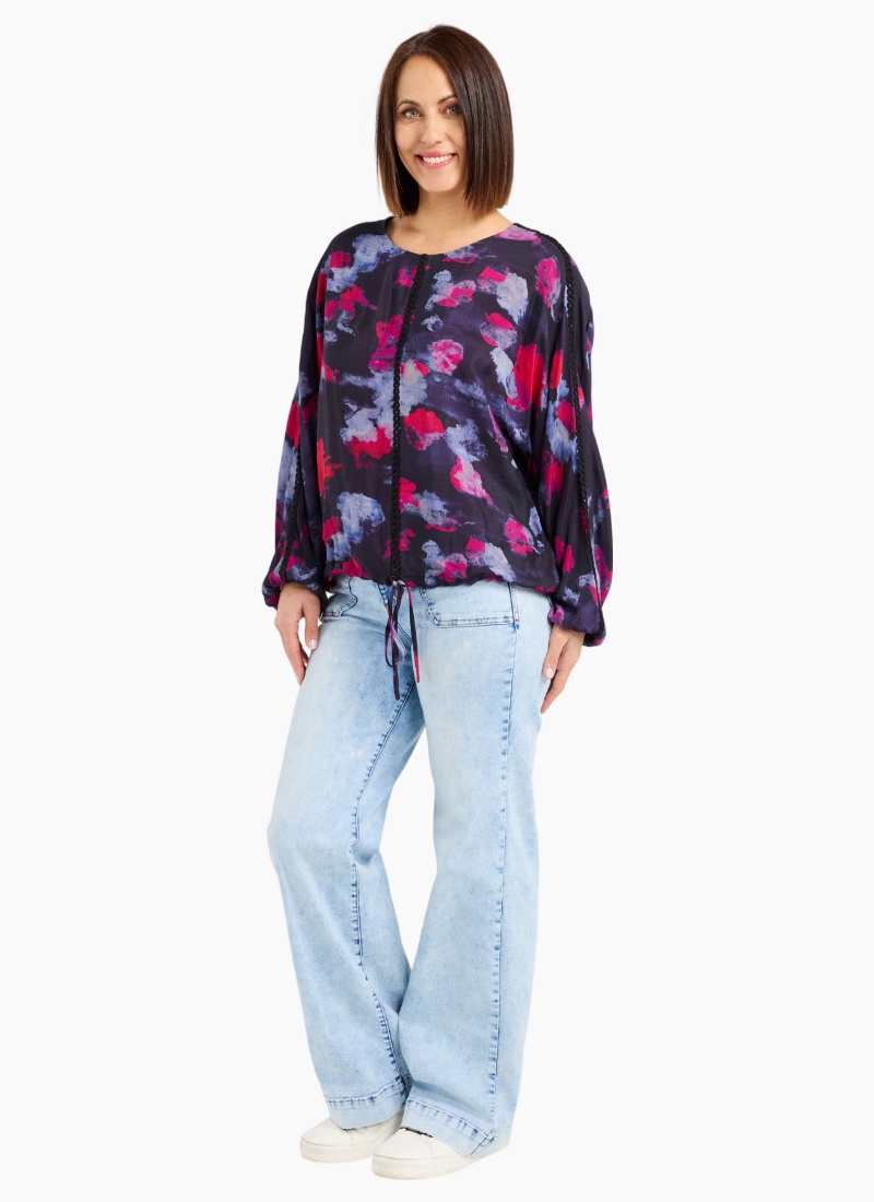 This long-sleeve top features a round neckline and a drawstring hem for a relaxed, adjustable fit. Subtle trim along the front and down the sleeves adds a refined, stylish detail to the classic silhouette. 50% Viscose 50% Rayon