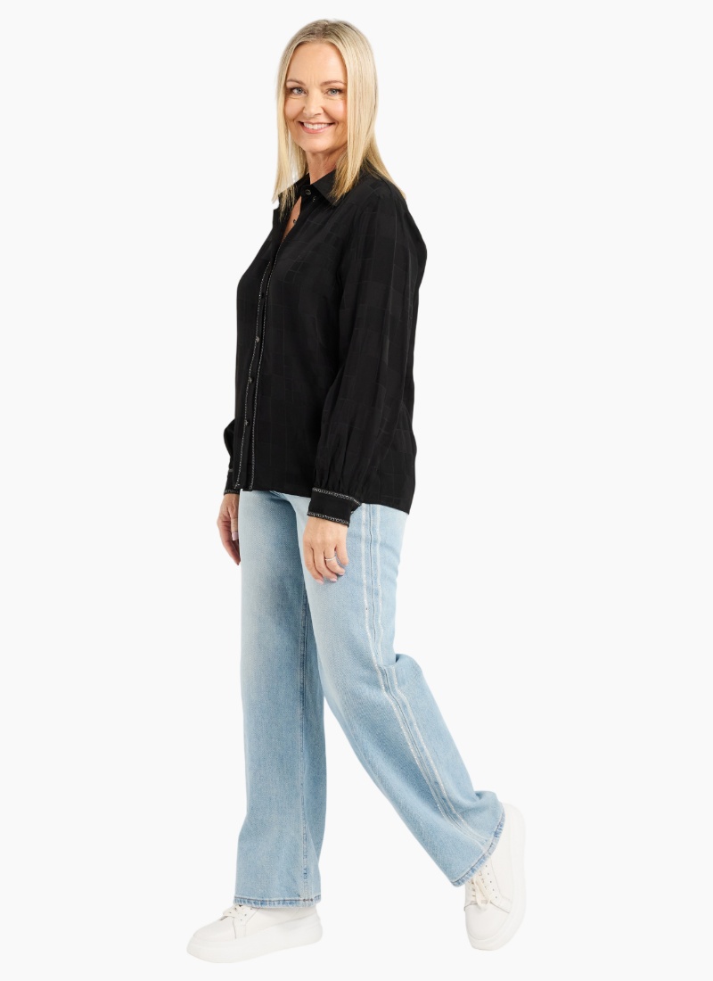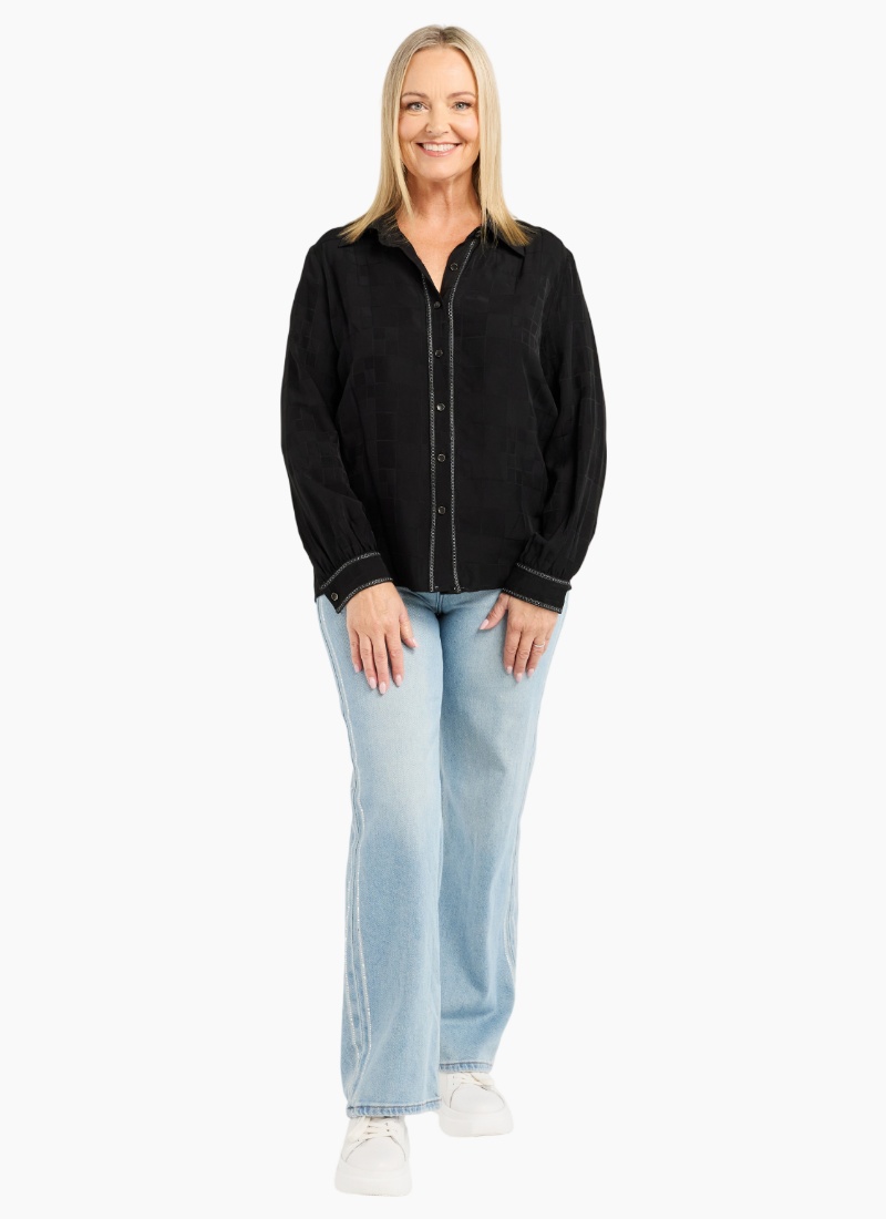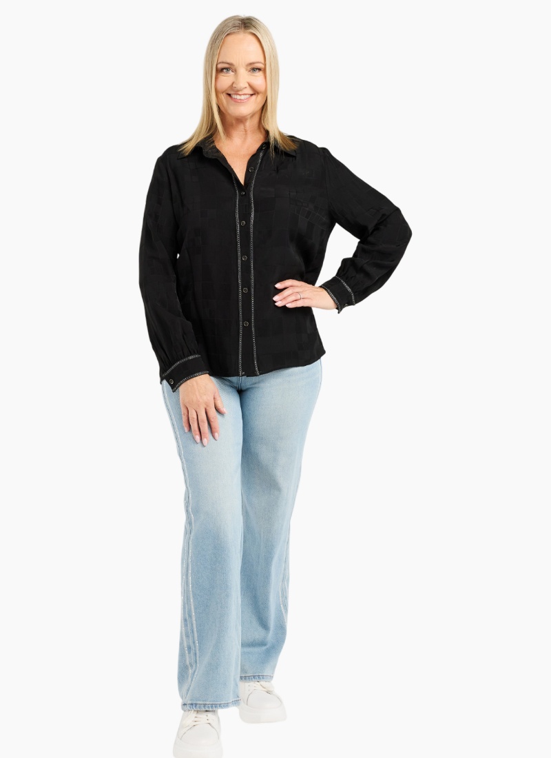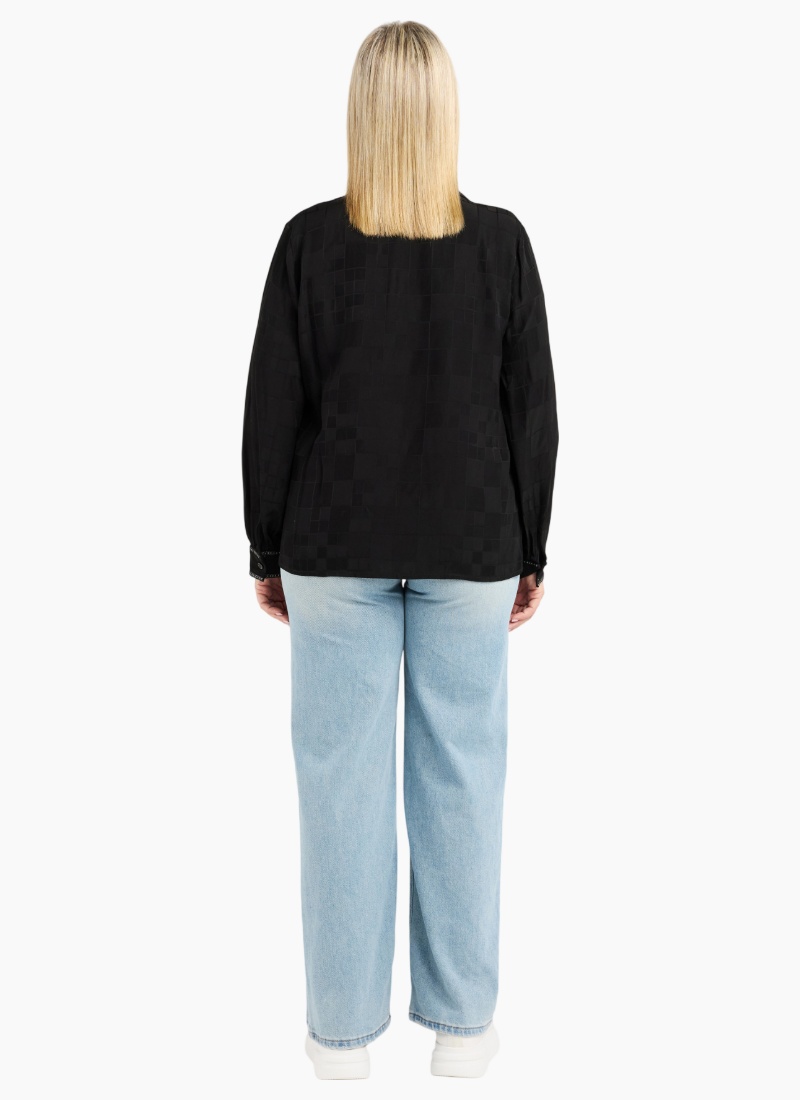 This button-down shirt features trim detailing along the button panel and sleeve cuffs for a refined finish. Crafted from modern black-colored fabric with a subtle square print, it offers a contemporary, stylish take on a classic silhouette. 90% Viscose 7% Tencel 3% Linen