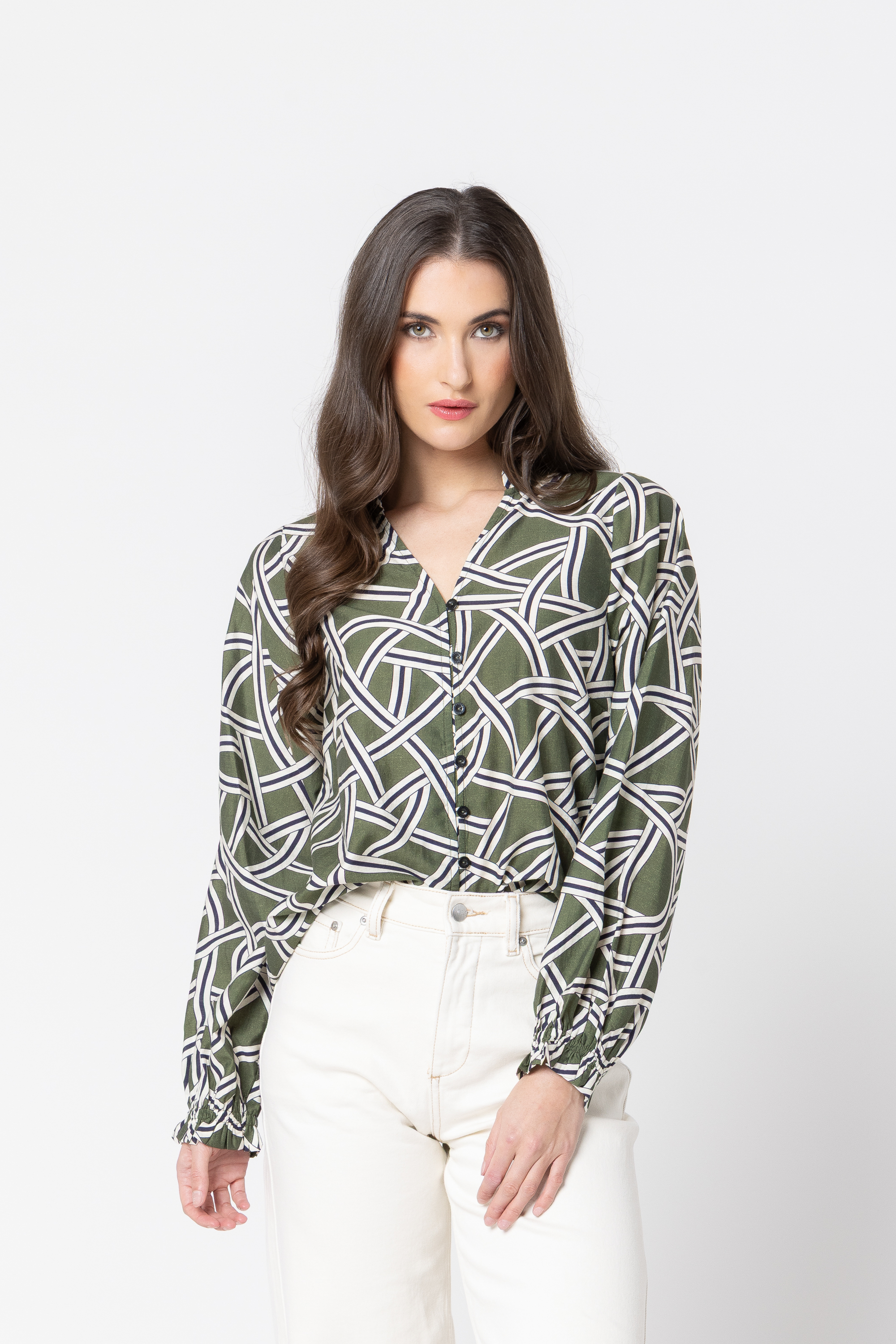 Bold chain-inspired print distinguishes an eye-catching shirt framed by a collar and raglan sleeve.