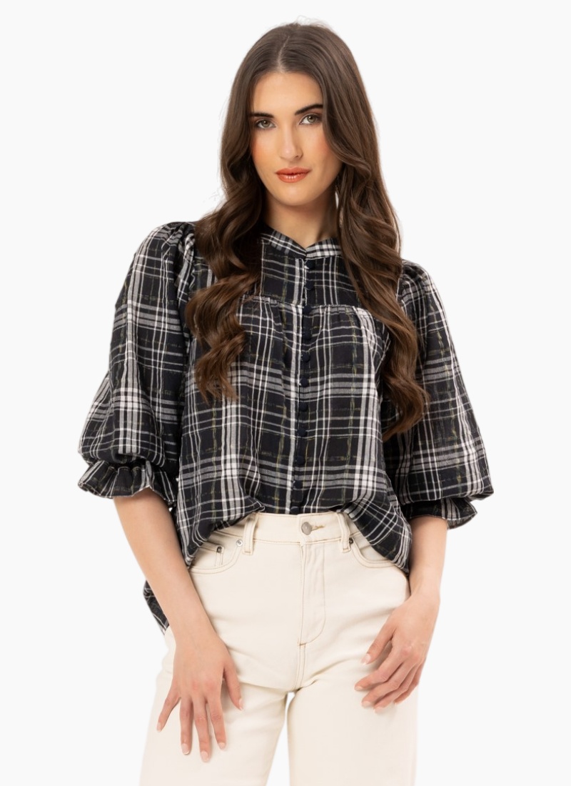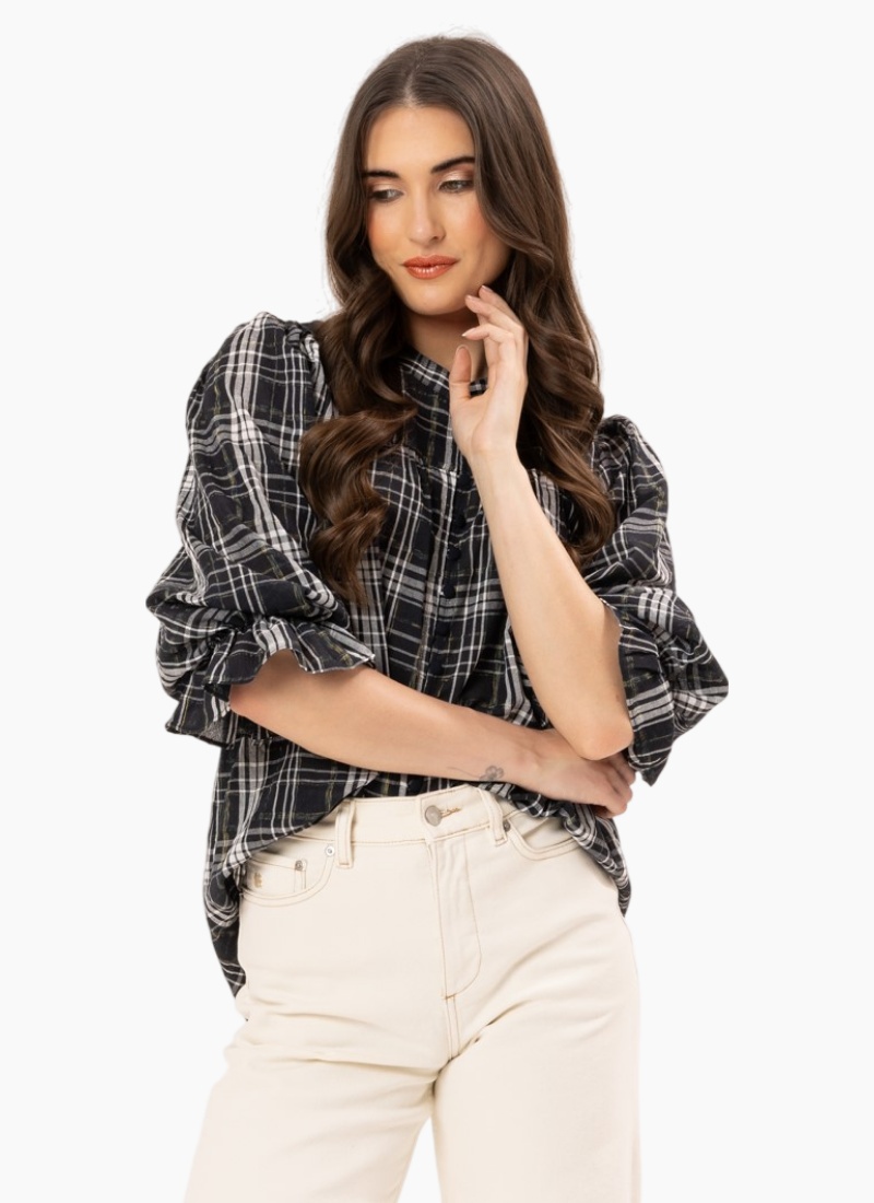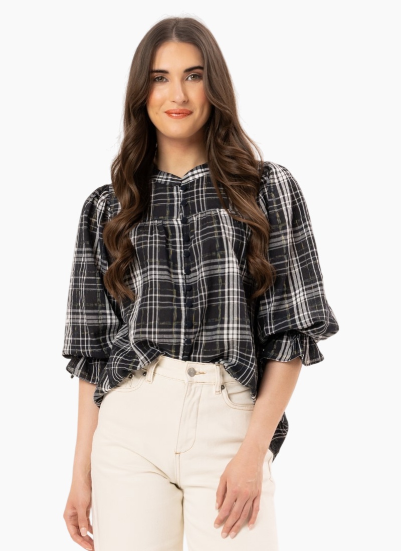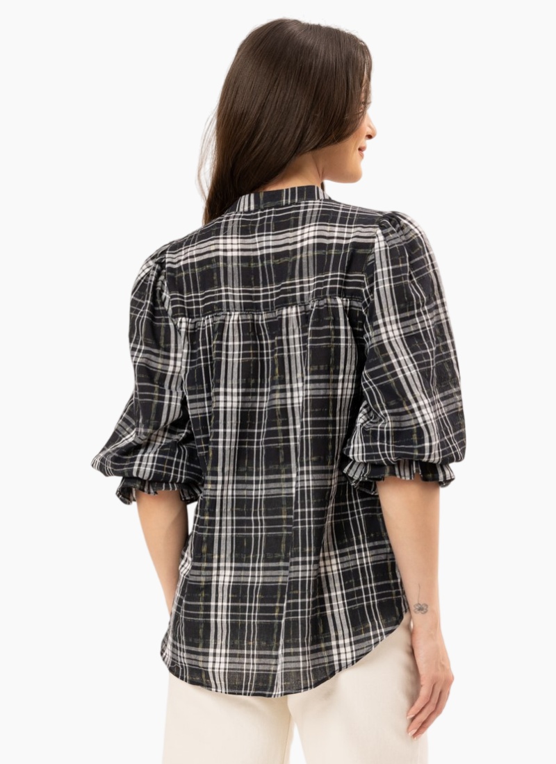 This plaid button-up shirt features a collar and 3/4-length puff sleeves. Casual yet elevated, try it tucked into your favorite bottoms.