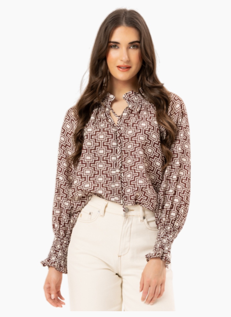 Make a modern statement in this woven shirt featuring a colorful geometric pattern.