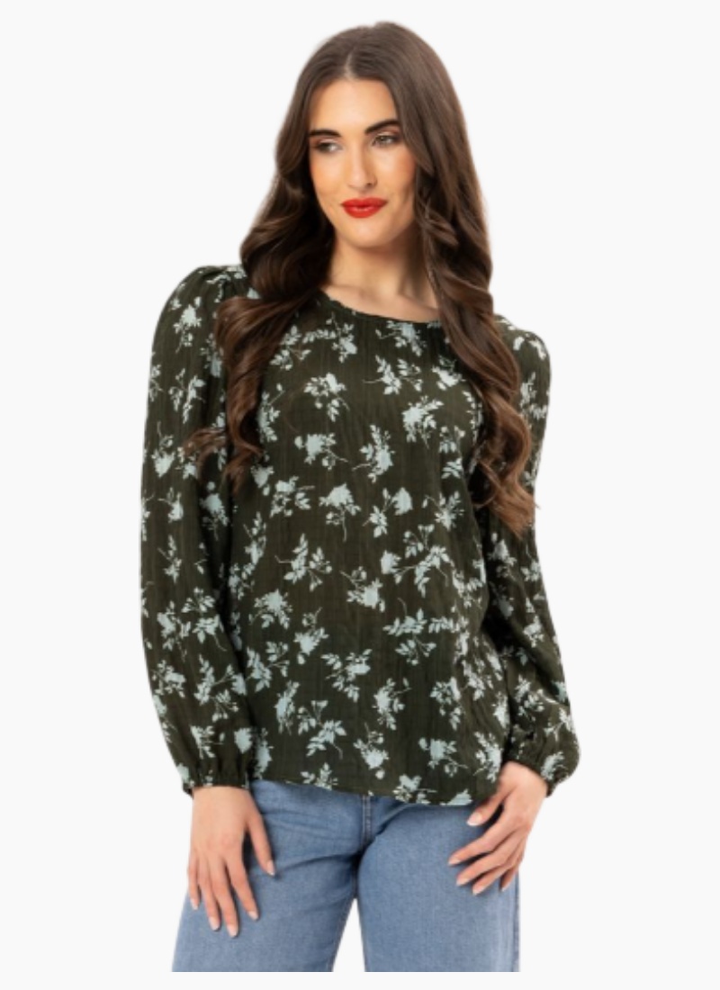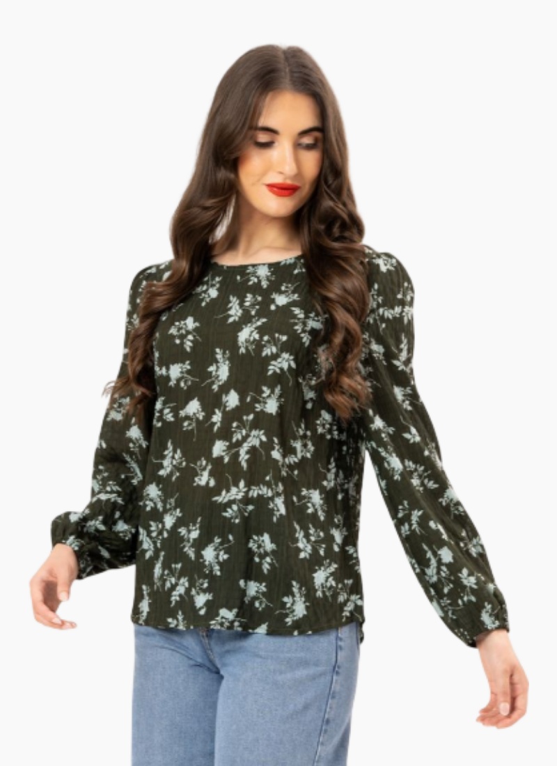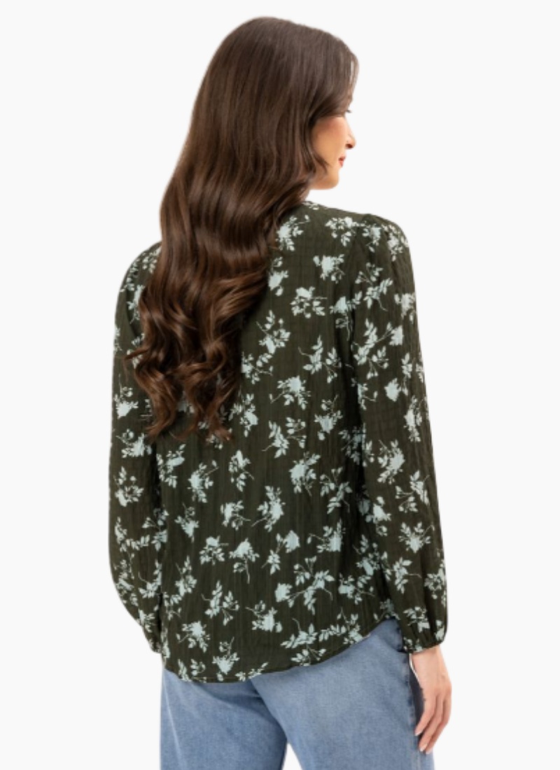 Introducing the GRATITUDE TOP FOREST SHADOW from Seeking Lola. A versatile Shirts & Blouses piece in a rich forest green with a soft mint floral print.