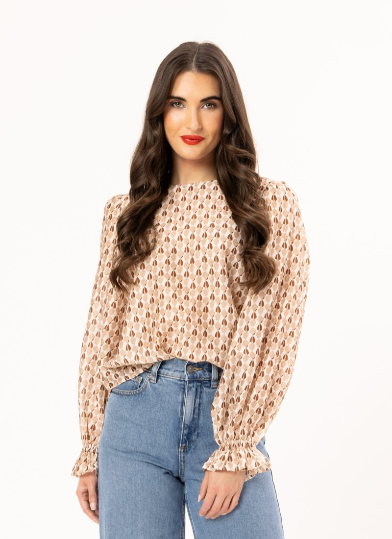Introducing the Harper Top in Chestnut Geo from Seeking Lola. This elegant blouse pairs a soft chestnut geometric print with an airy, feminine silhouette.