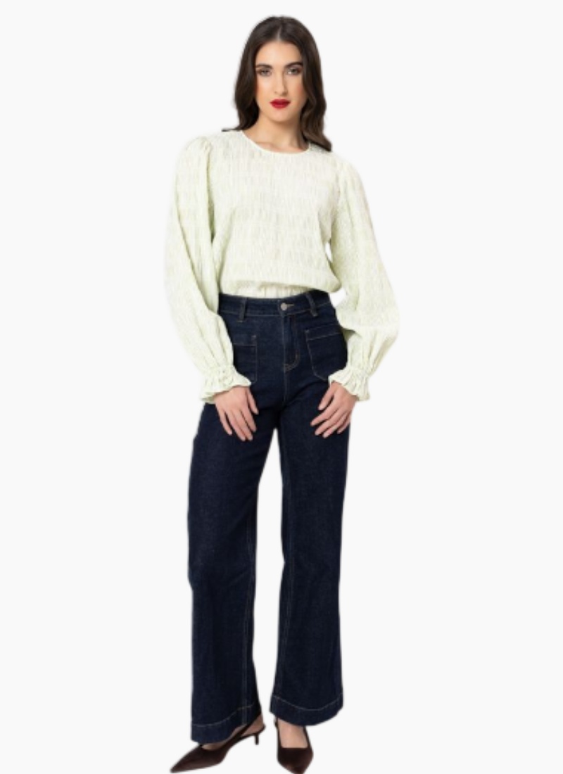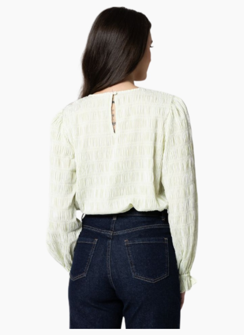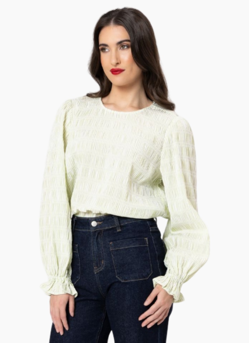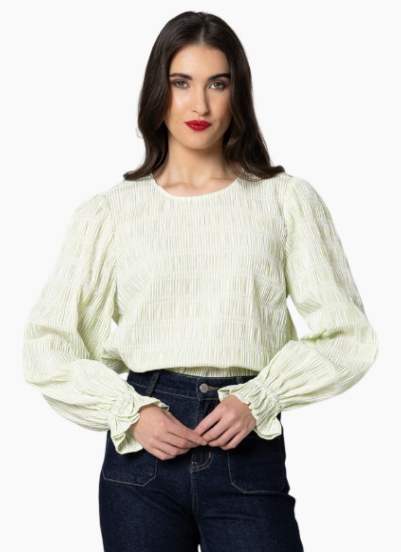 - Features a round neckline and softly gathered puff sleeves with smocked, elasticated cuffs