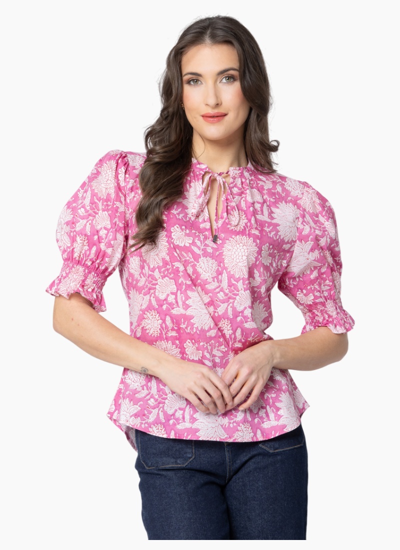 A floral print in pink peppers a breathable cotton blouse that's framed by puff sleeves.