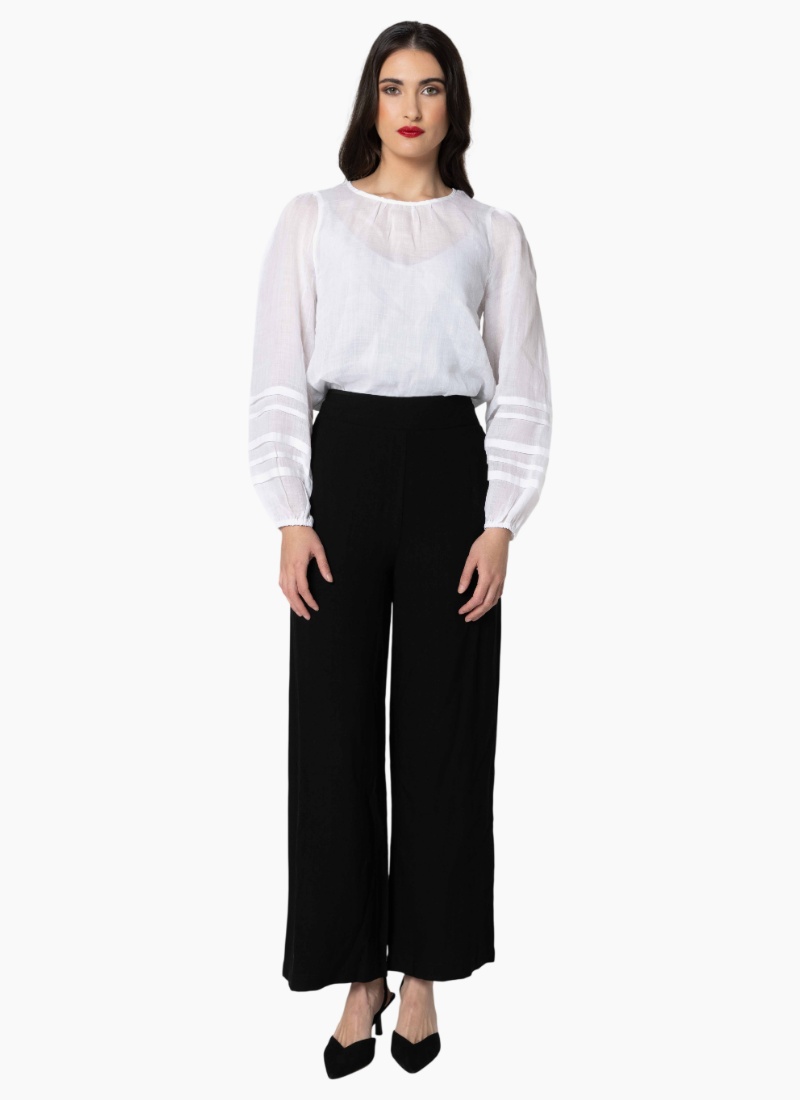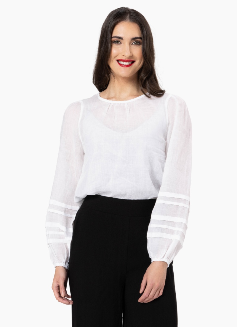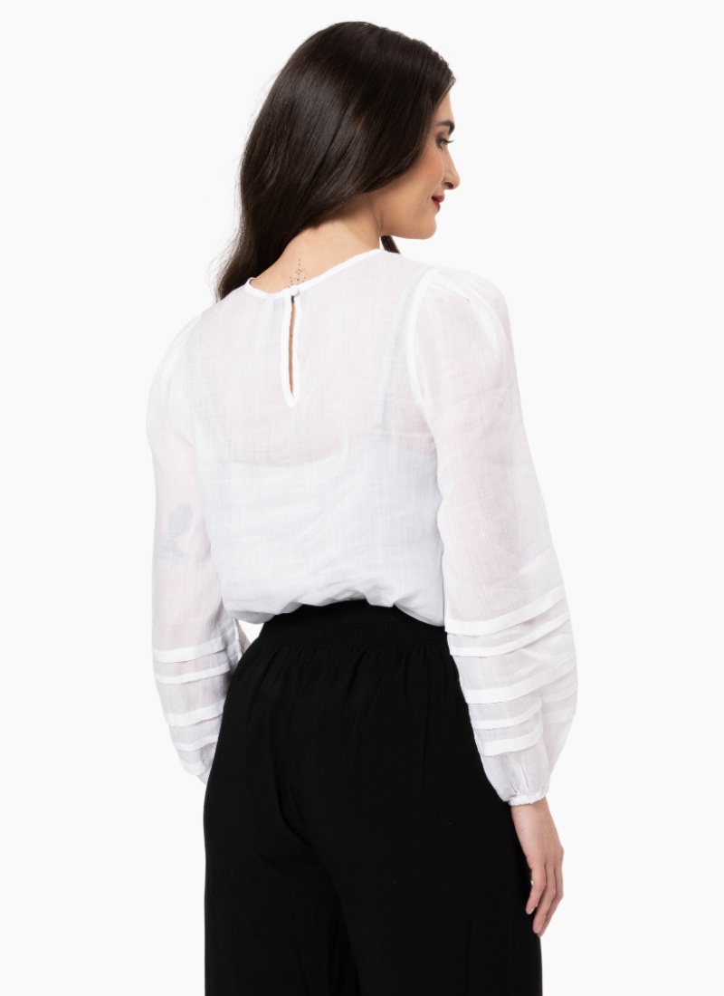 The Milly Top is a masterclass in ethereal, breezy elegance. Rendered in a crisp, clean white, this top features a delicate round neckline and a subtle keyhole closure at the back for a refined finish. The standout design element is the voluminous blouson sleeves, accented with horizontal tuck detailing and soft elasticated cuffs, creating a romantic silhouette that pairs perfectly with tailored trousers.