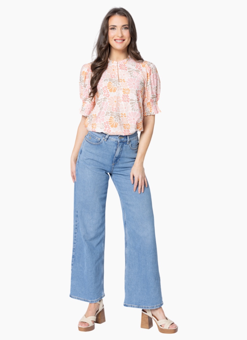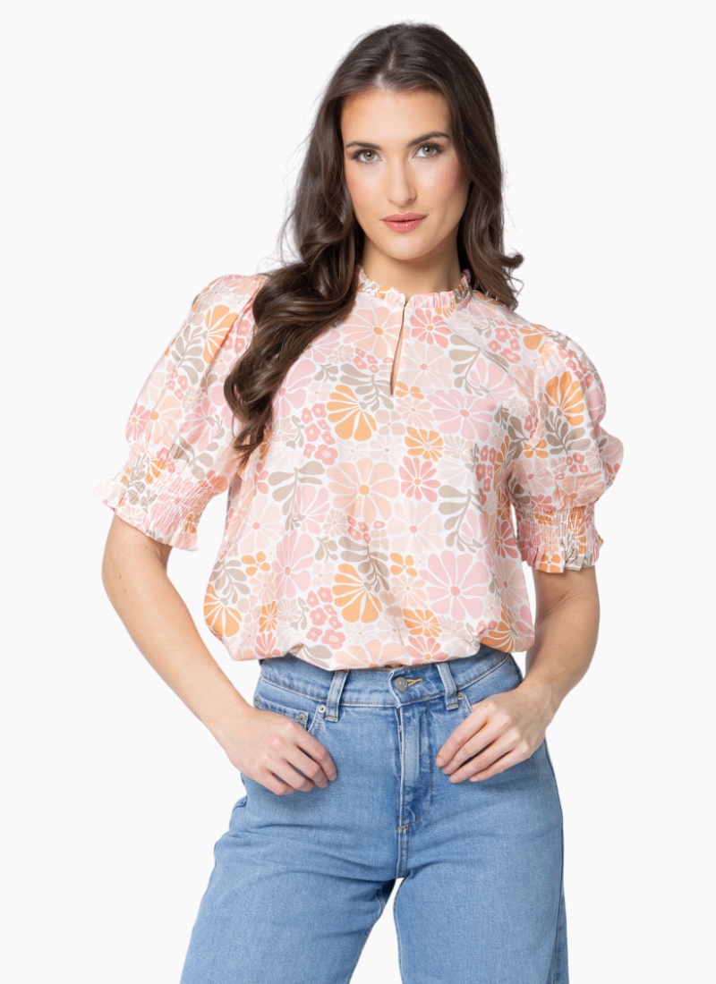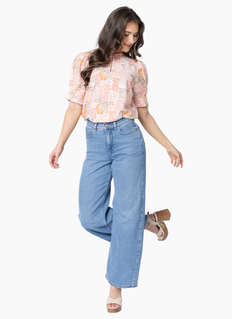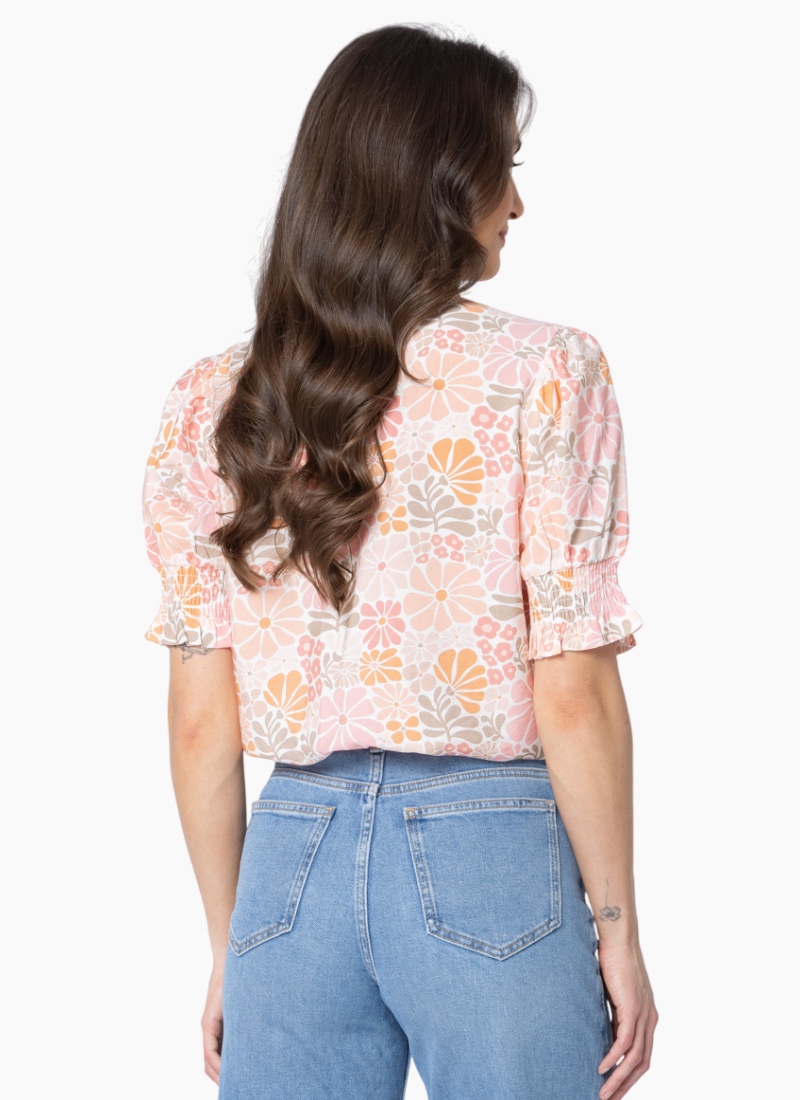 Effortlessly feminine and beautifully detailed — this floral blouse is crafted from a soft cotton-linen blend for breathability and comfort all day long. The ¾ puff sleeves with shirred cuffs add a romantic touch, while the V-neckline and delicate frilled collar strike the perfect balance between polish and ease. Finished with a subtle hook-and-eye closure for a touch of versatility.Fabric: 85% Rayon, 15% Nylon