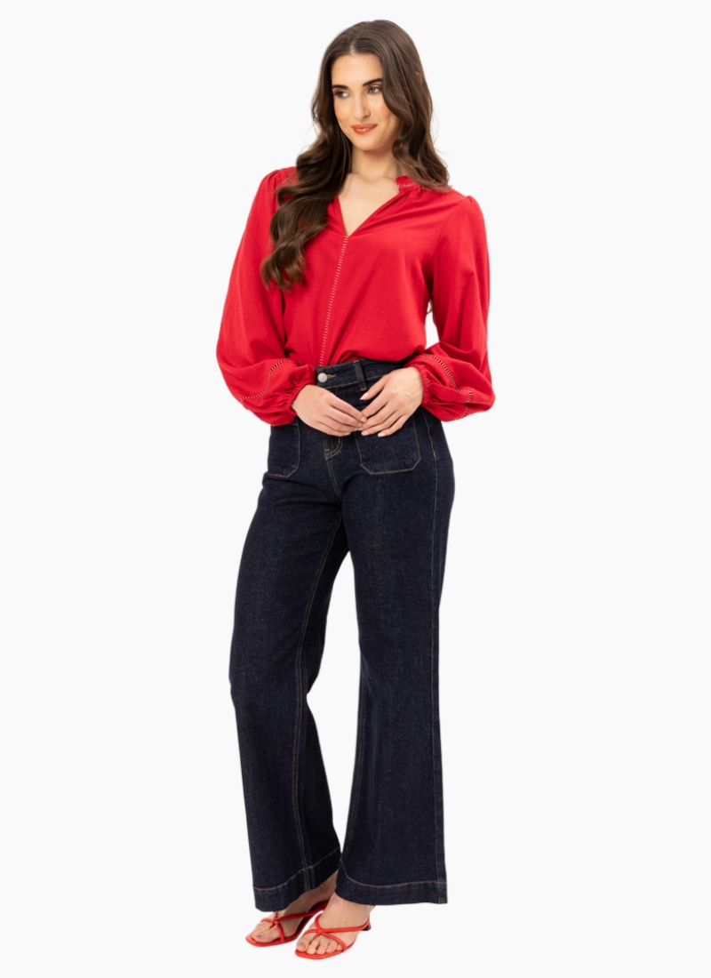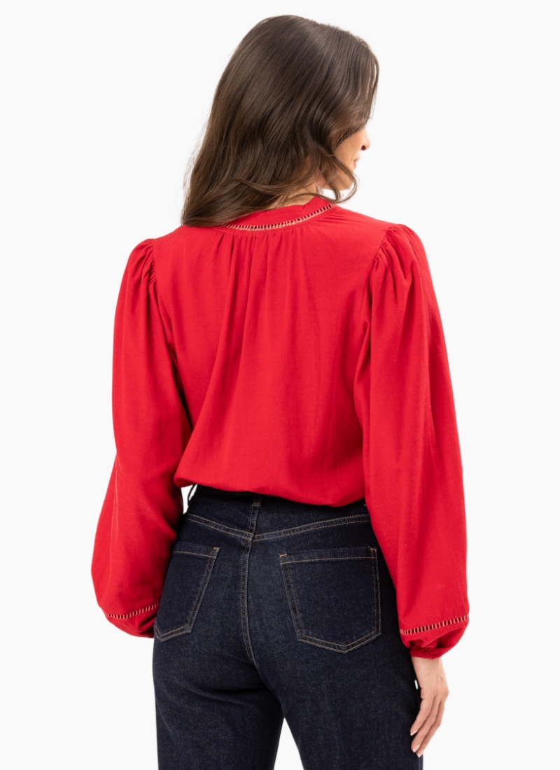 The Sylvie Top in vibrant Ruby is a sophisticated essential designed for a polished look. Featuring a flattering V-neckline and delicate ladder-stitch embroidery, this piece offers an effortless transition from the office to evening outings.Design Highlights Embroidered Accents: Elegant ladder-stitch detailing along the neckline and cuffs. Romantic Sleeves: Full blouson sleeves with soft elasticated cuffs. Refined Neckline: A soft V-neck with subtle gathering at the shoulders. Flattering Fit: A graceful, airy silhouette with a clean back-yoke finish. Care Instructions Color: Rich Ruby red. Care: Cold hand wash recommended; dry in the shade to maintain color vibrancy.