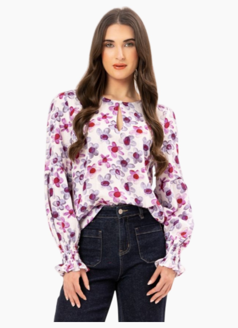 Introducing the Vienna Blouse Violet Bloom from Seeking Lola. A fresh, feminine blouse that brings effortless charm to your wardrobe.-Embrace the beauty of floral prints and make a statement wherever you go! Our stunning violet floral blouse, designed for effortless style and comfort. Featuring long sleeves with shirred cuffs, a chic round neck adorned with a button and keyhole detail at front, and a flattering curved hem, this blouse is crafted from 100% viscose fabric for a soft, breathable feel.