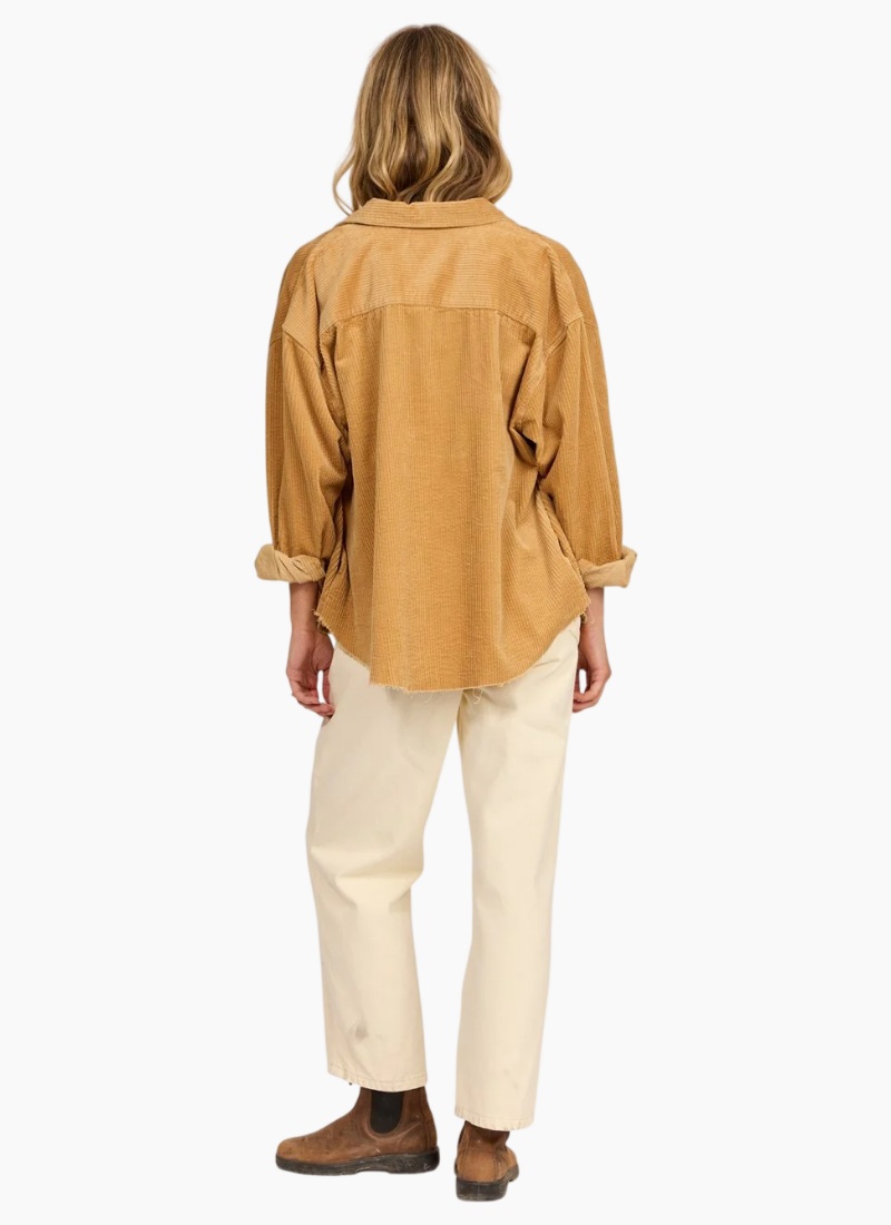 Oversized relaxed fit with patch pockets and raw edged hem.