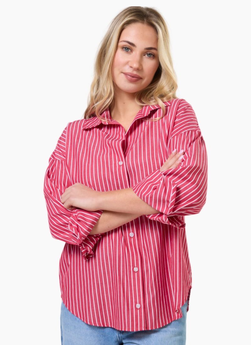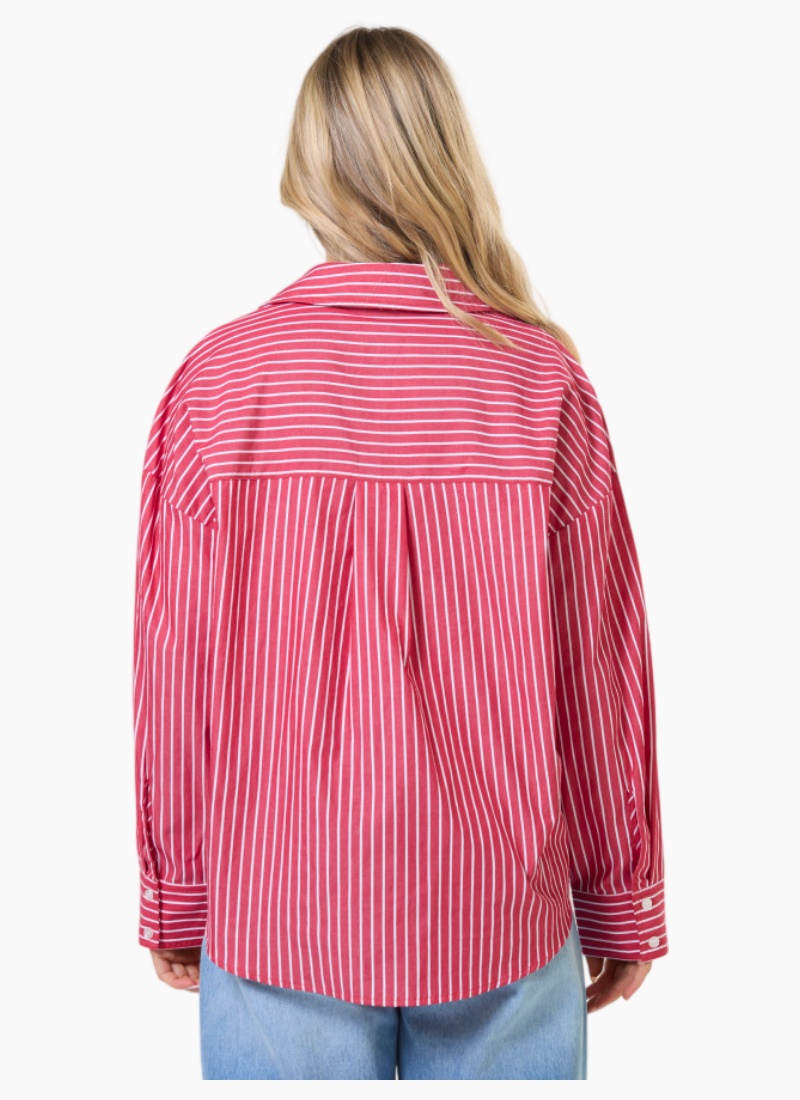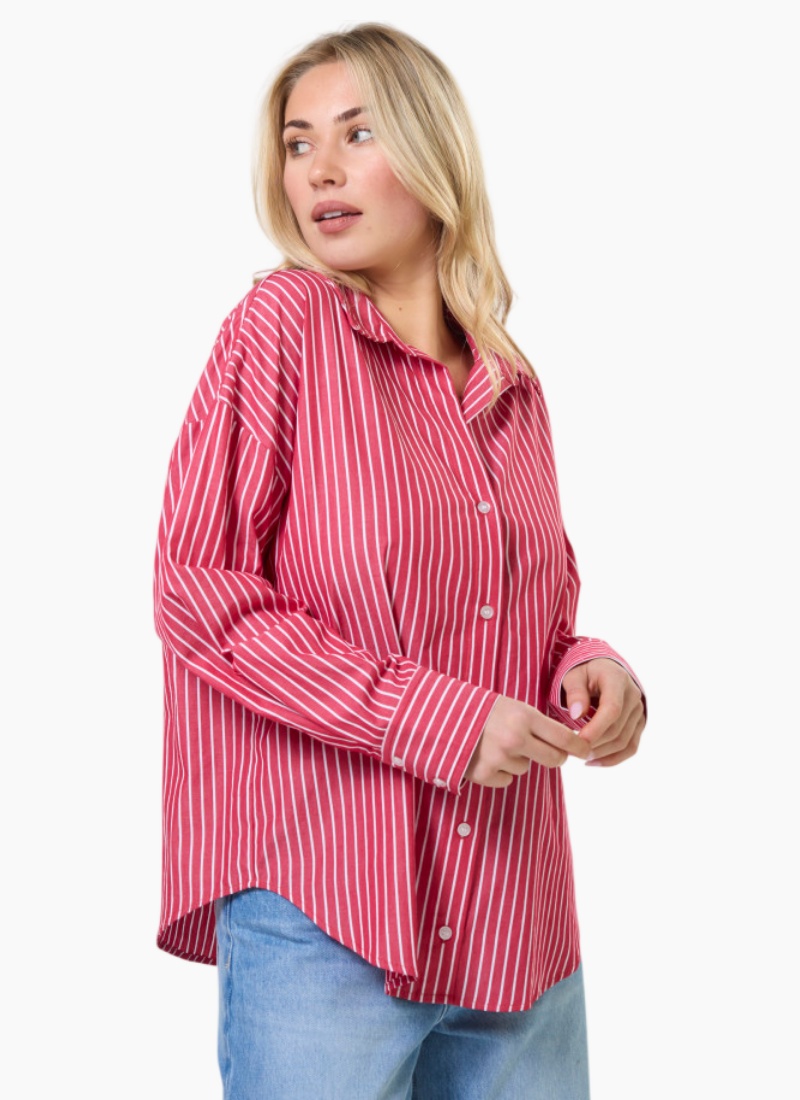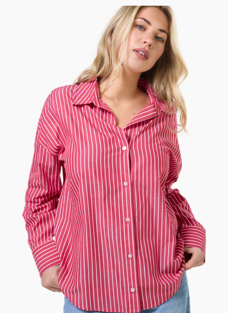 - Vertical scarlet and white stripes elongate the frame while the relaxed cut layers beautifully over denim