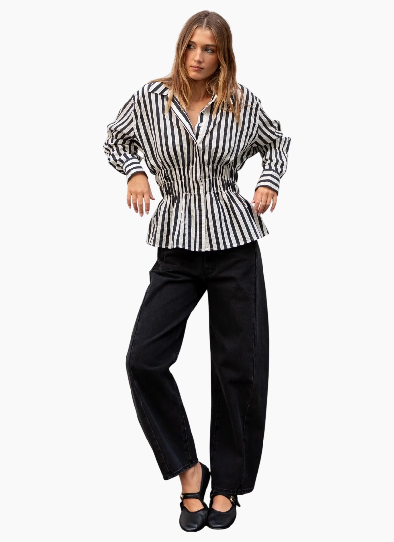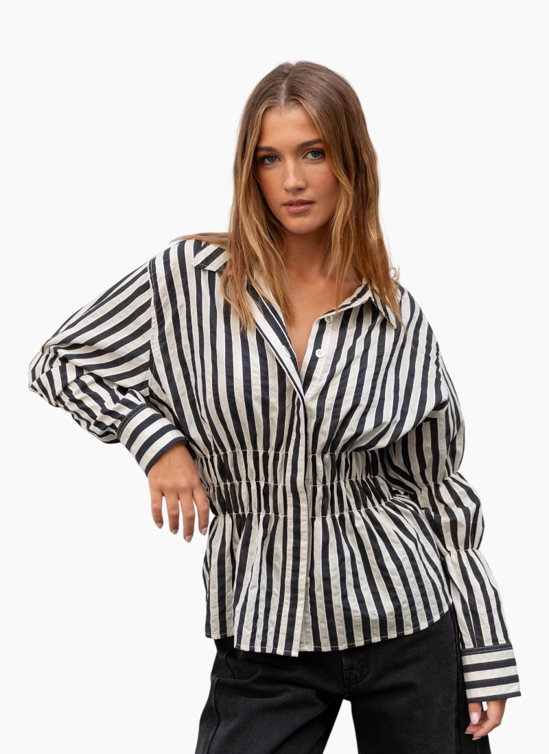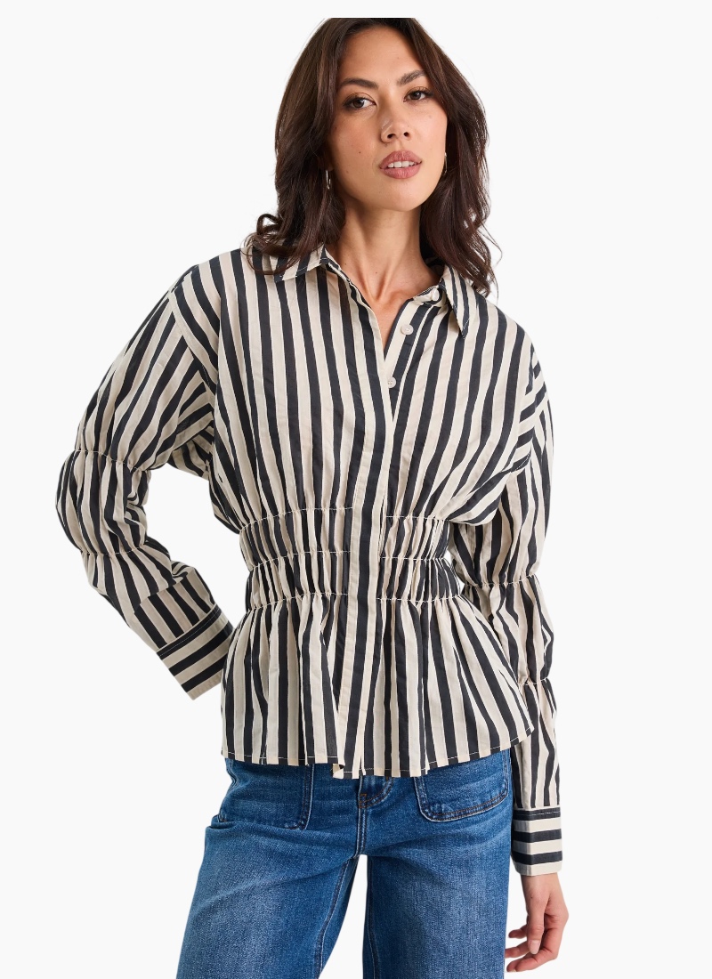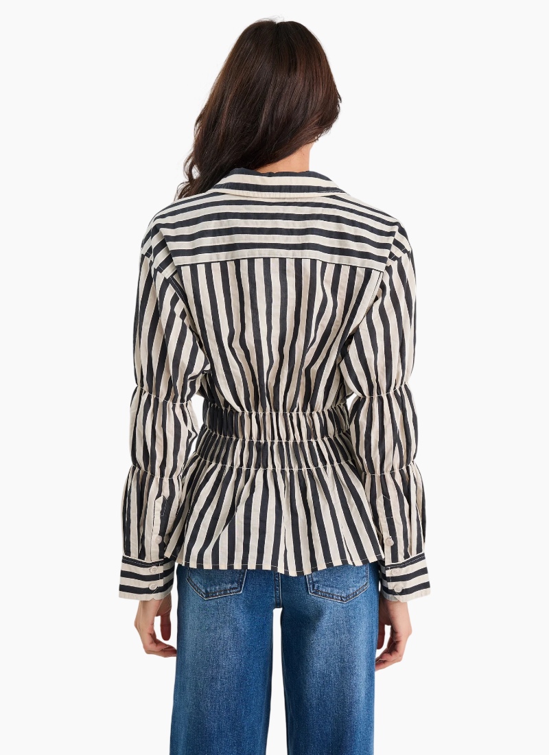 With a cinched waist and a bold stripe, this shirt puts a modern spin on classic shirting. The shirred bodice creates a flattering hourglass shape, while the crisp cotton fabric keeps it structured yet breathable. In black/bone stripes, it brings a punch of colour to everyday dressing. Pair with jeans for a defined off-duty look or tuck into tailored trousers for a polished twist.