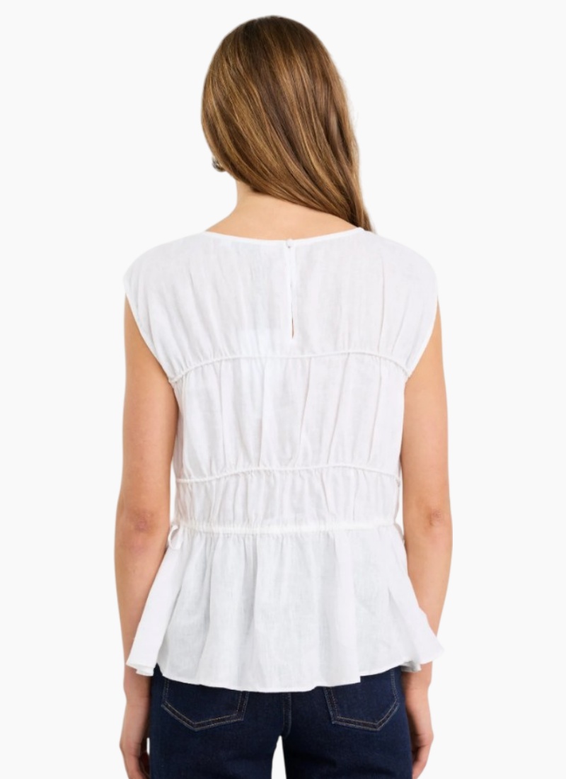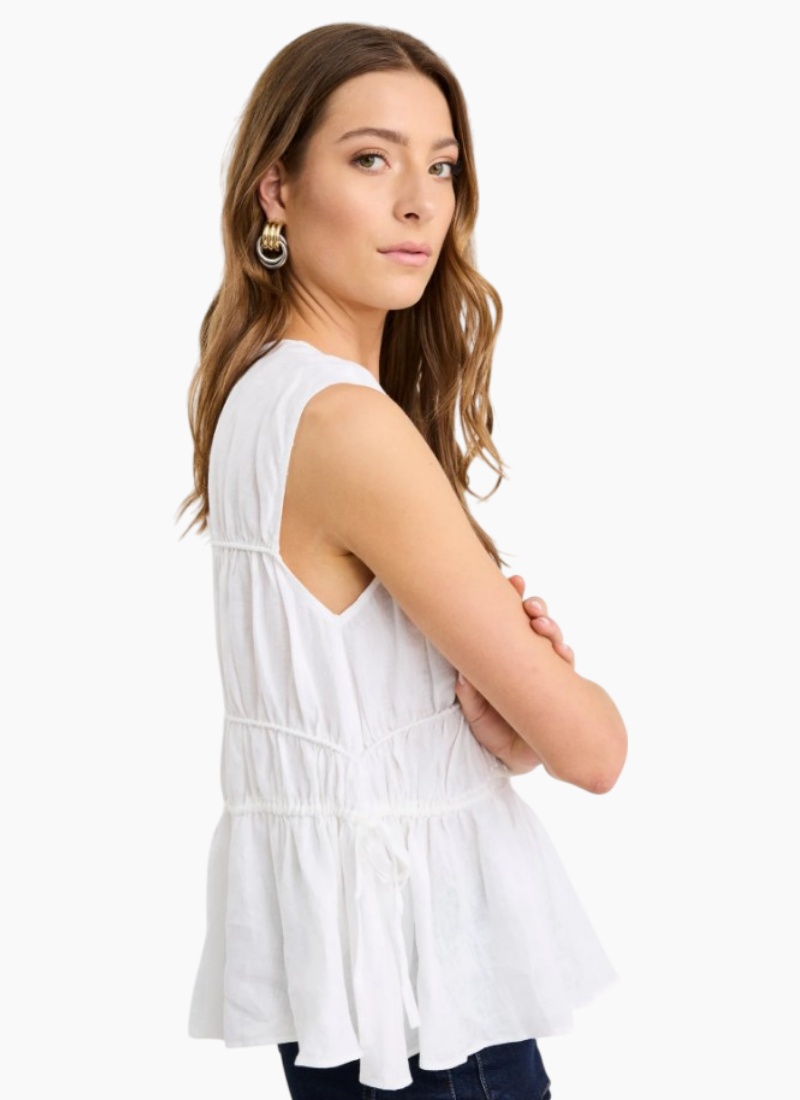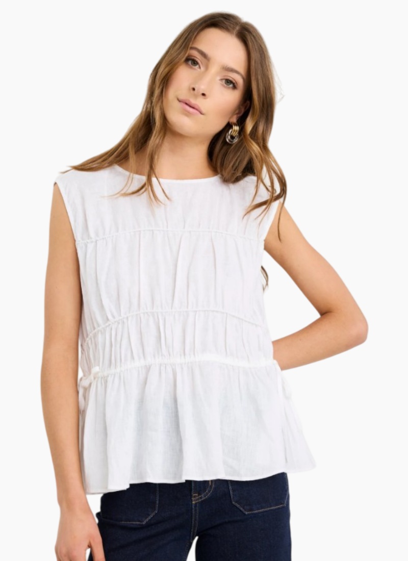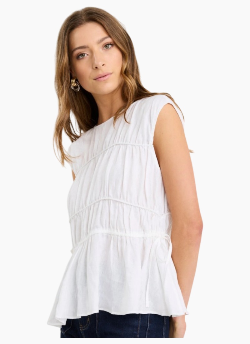 Light, breezy, and oh-so-chic, the Context top will become a wardrobe favourite. Crafted from 100% linen, this natural fibre style features feminine gathered details with soft tie accents for an elevated, playful twist.Pair it with denim and sandals for a relaxed look, or layer under a blazer for a fresh, put-together vibe.
