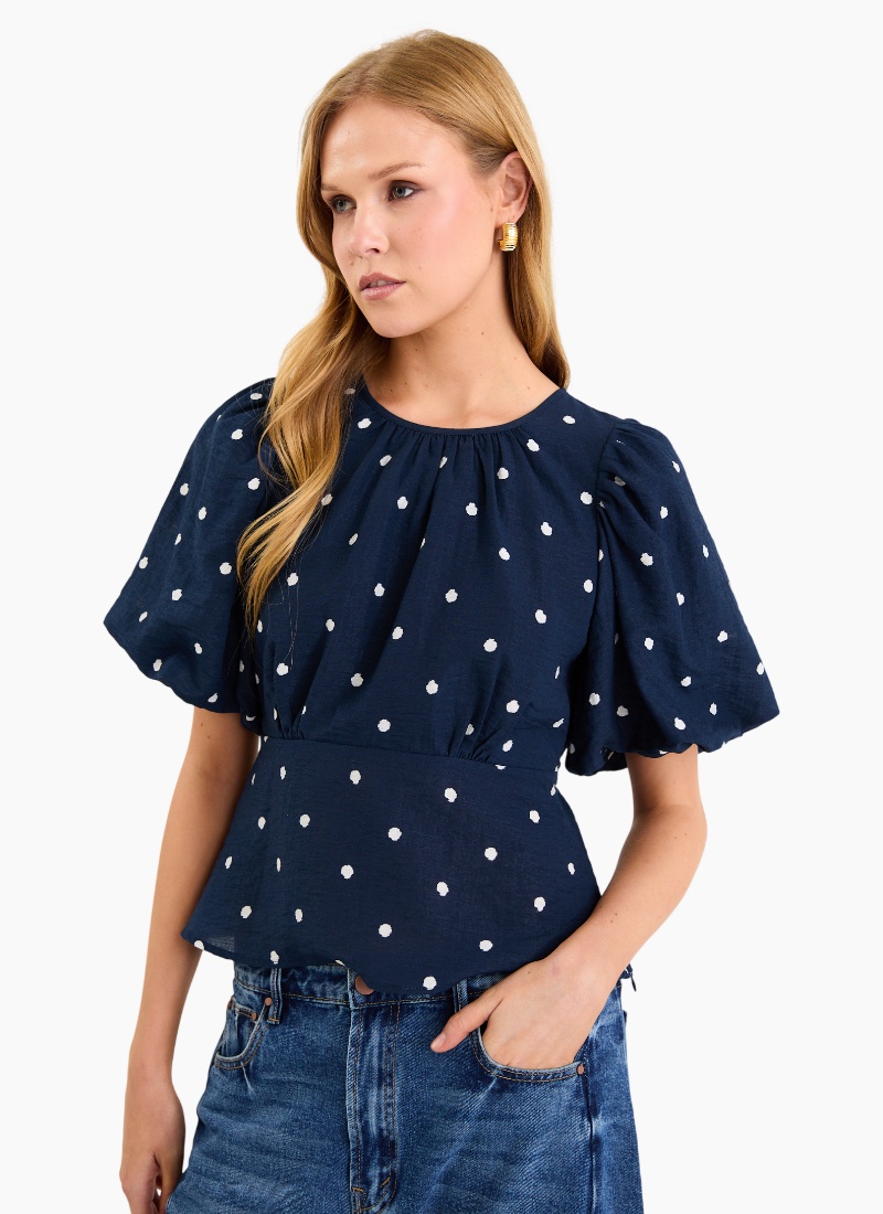 A playful take on an everyday favourite. The Finali Top brings together a sweet polka dot print with floaty bubble sleeves, creating an effortless silhouette that dresses up denim in an instant.