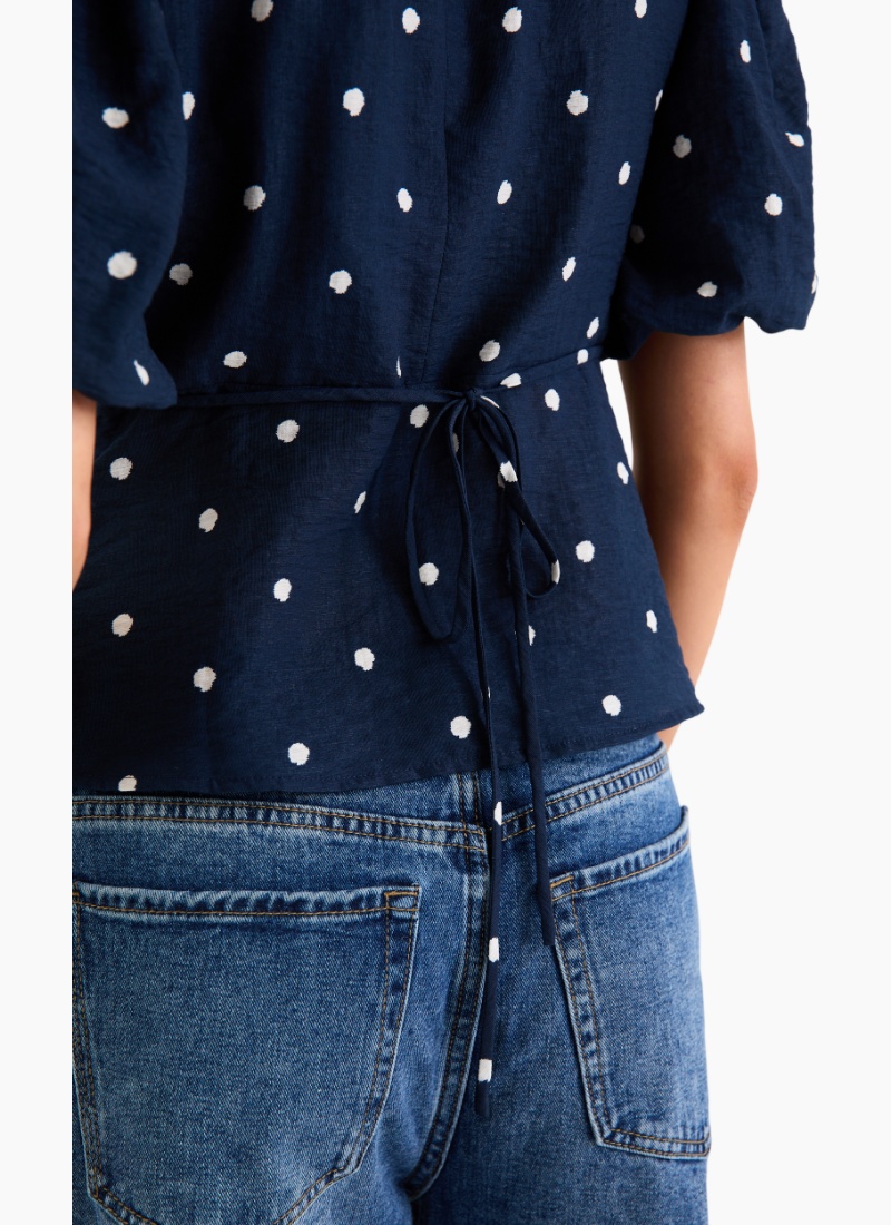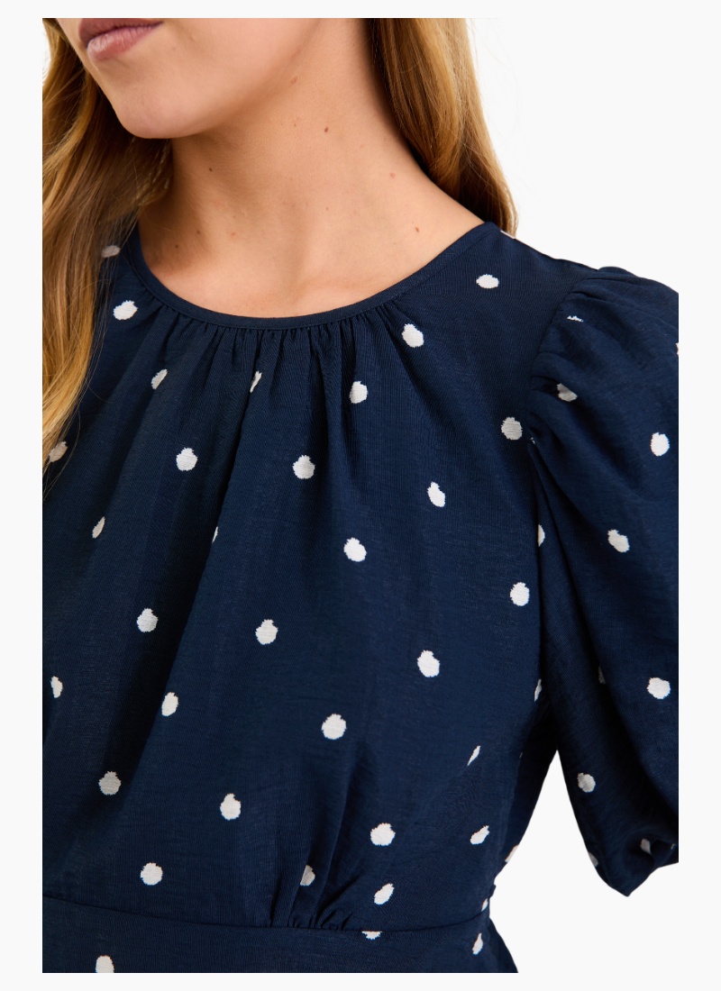 - Navy base with a playful all-over polka dot print