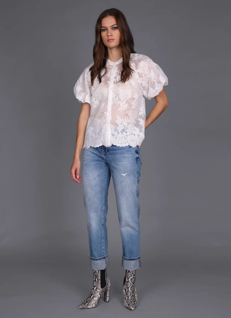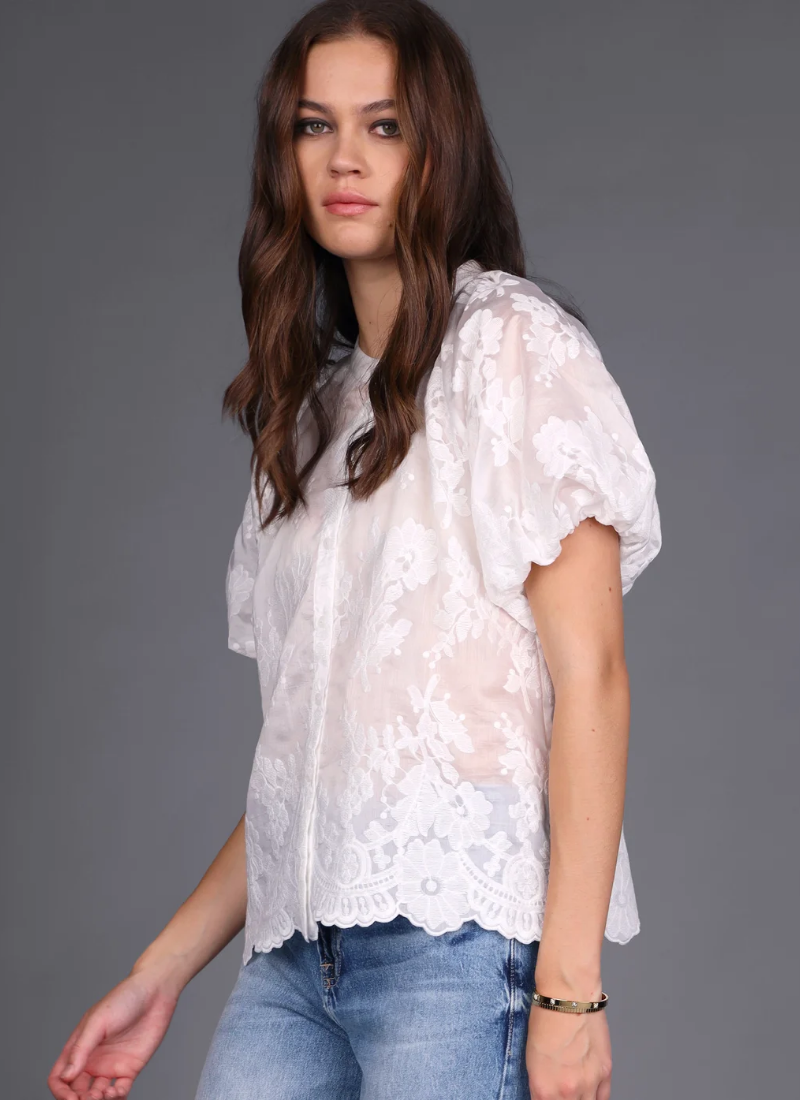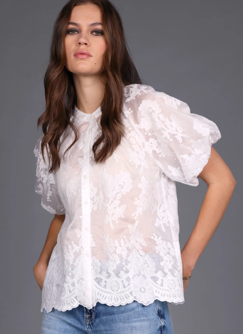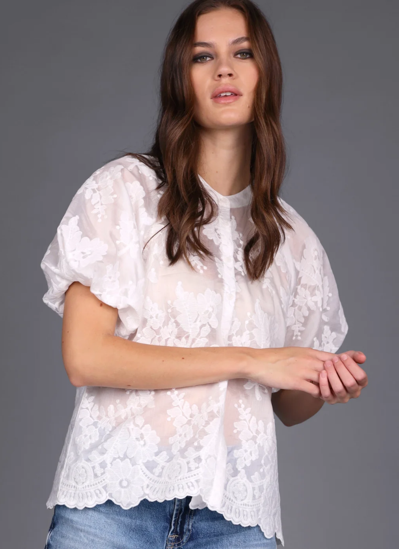 Timeless feminine Styling, our Embroidered Lace Shirt is a must-have for SummerCrafted in a lightweight, sheer embroidered lace fabric that’s lightweight and breathable. Featuring a rounded neckline with a button front, elongated puff sleeves for the perfect touch of feminine styling. Designed for a slim fit silhouette, this shirt layers perfectly on its own or over your favorite Summer underlayers. Style tip: Style this with our Seam Detail Wide Leg Pant for a monochromatic look that will have all eyes on you. Pheobe is 5’9 and wears a size 8 80% Tencel 20% Polyester - Cold hand wash separately inside out with mild detergent, do not soak rub or wring do not tumble dry. Dry cleanable