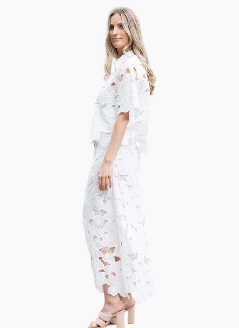 - Scalloped cutwork edges and relaxed short sleeves add handcrafted appeal and flattering movement