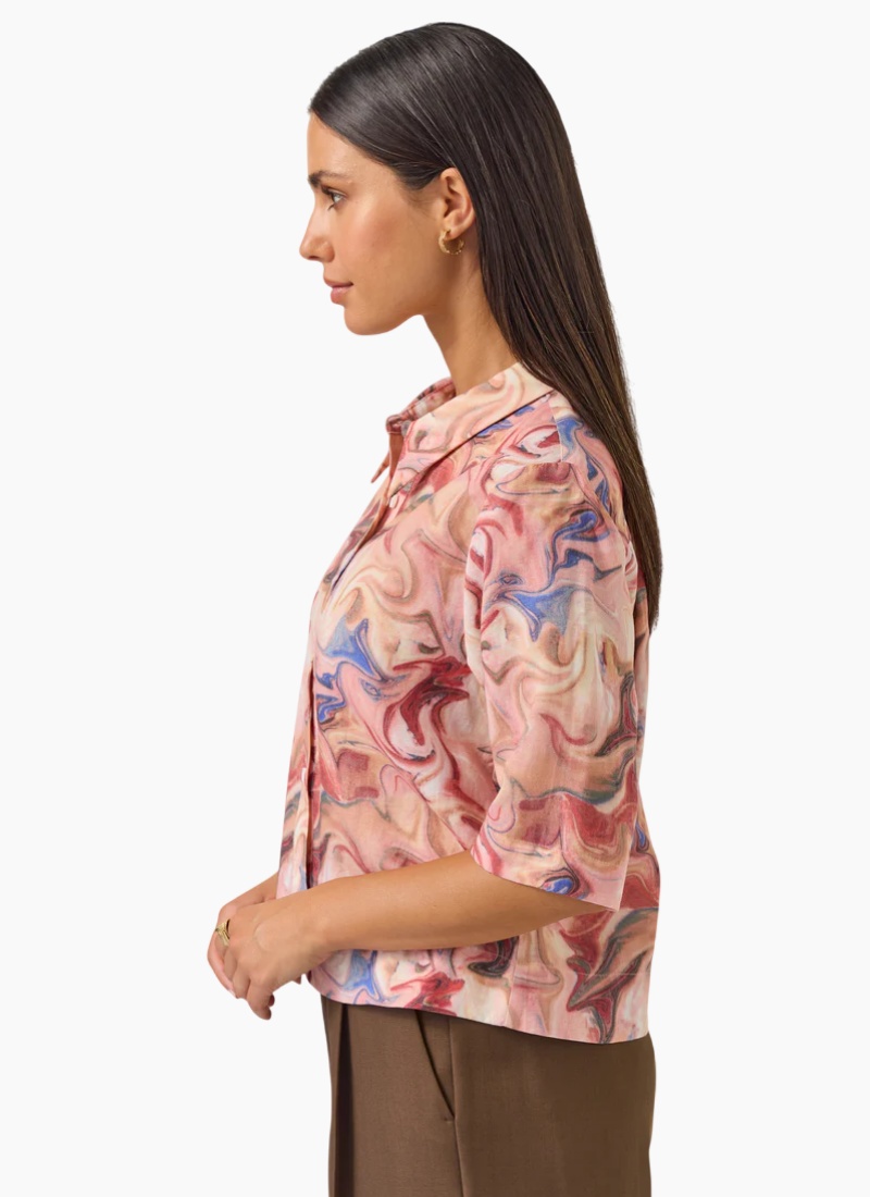 - Features a swirling whirlpool print in pink with touches of blue and cream, a vibrant addition to the Shirts & Blouses category