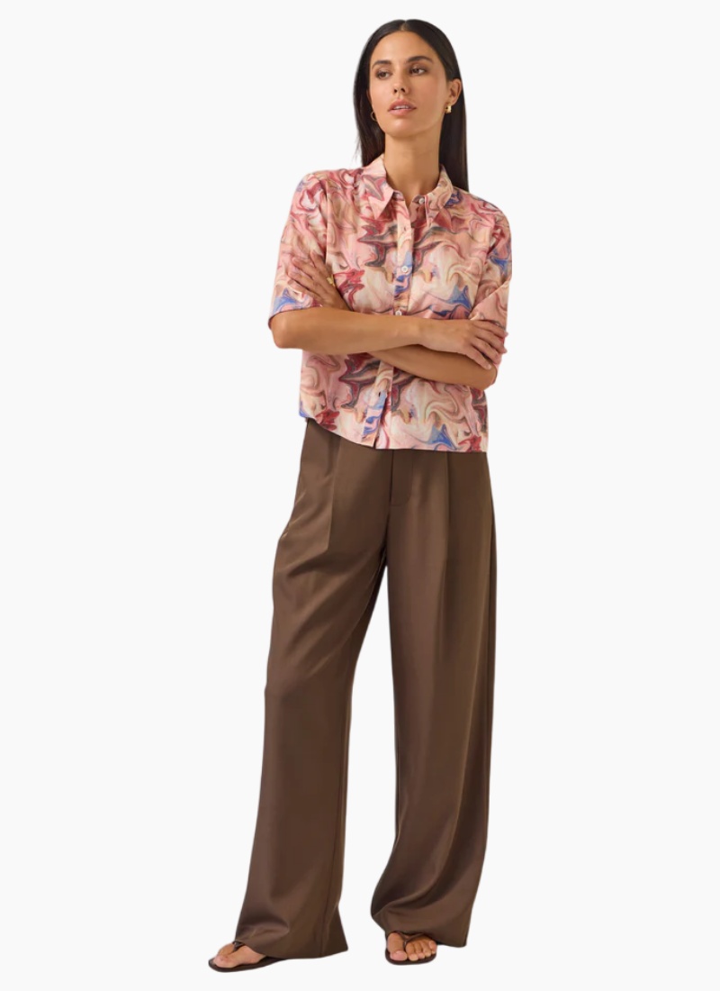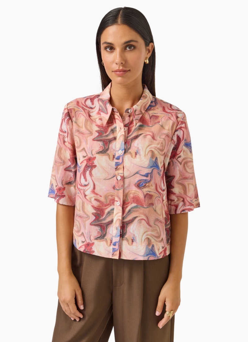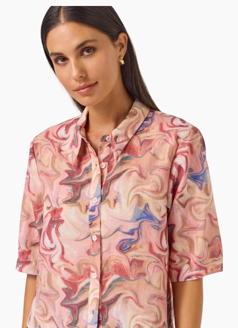 Introducing the Imogen Shirt from Tuesday Label. An artful whirlpool-print shirt in soft pink with a relaxed, boxy silhouette that's effortless to wear.
