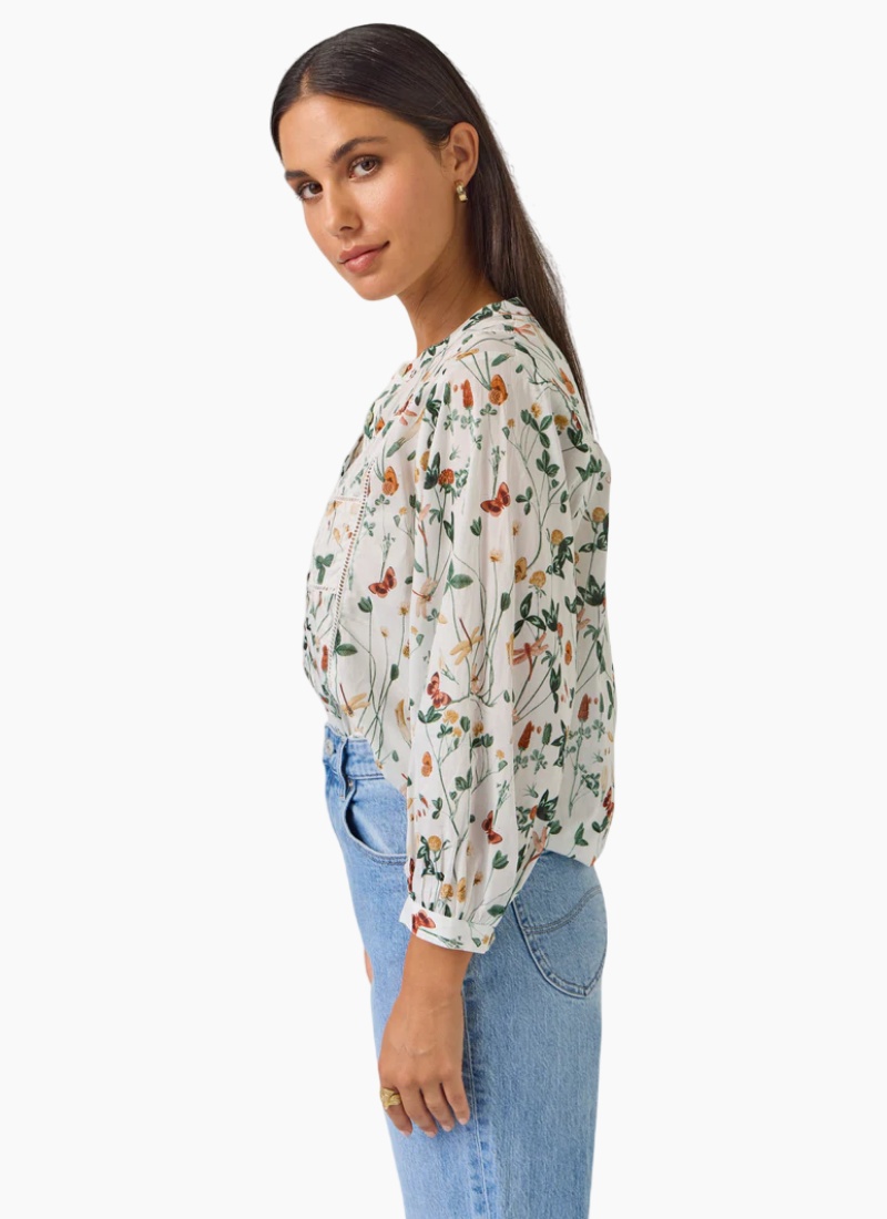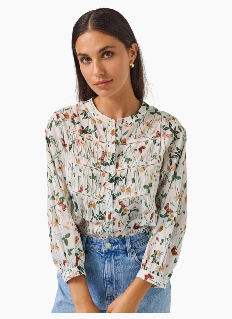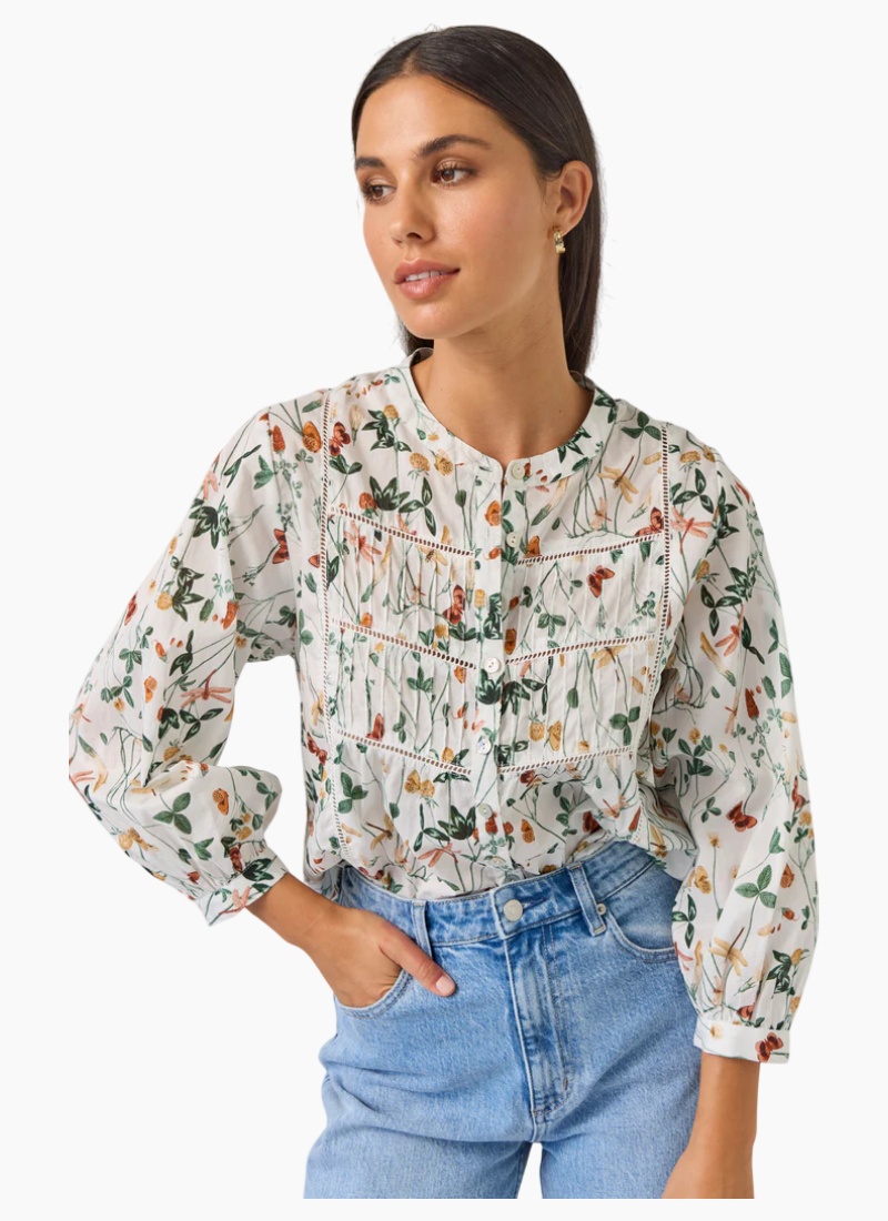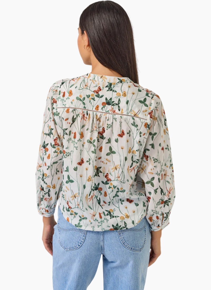 Introducing the Maeve Top | Dragonfly from Tuesday Label. This airy blouse showcases a delicate dragonfly and wildflower print on an ivory background, perfect for relaxed everyday styling.