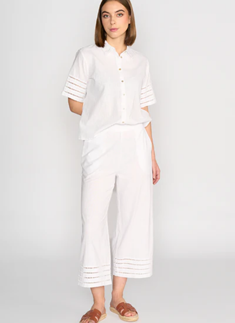 - Short sleeves finished with ladder trim add subtle texture and airiness