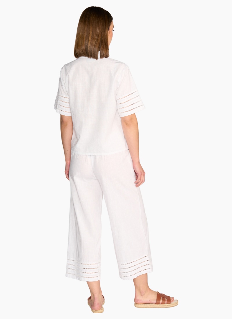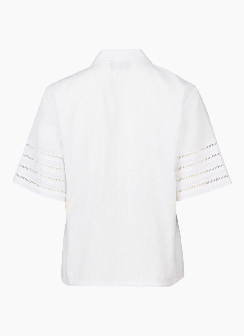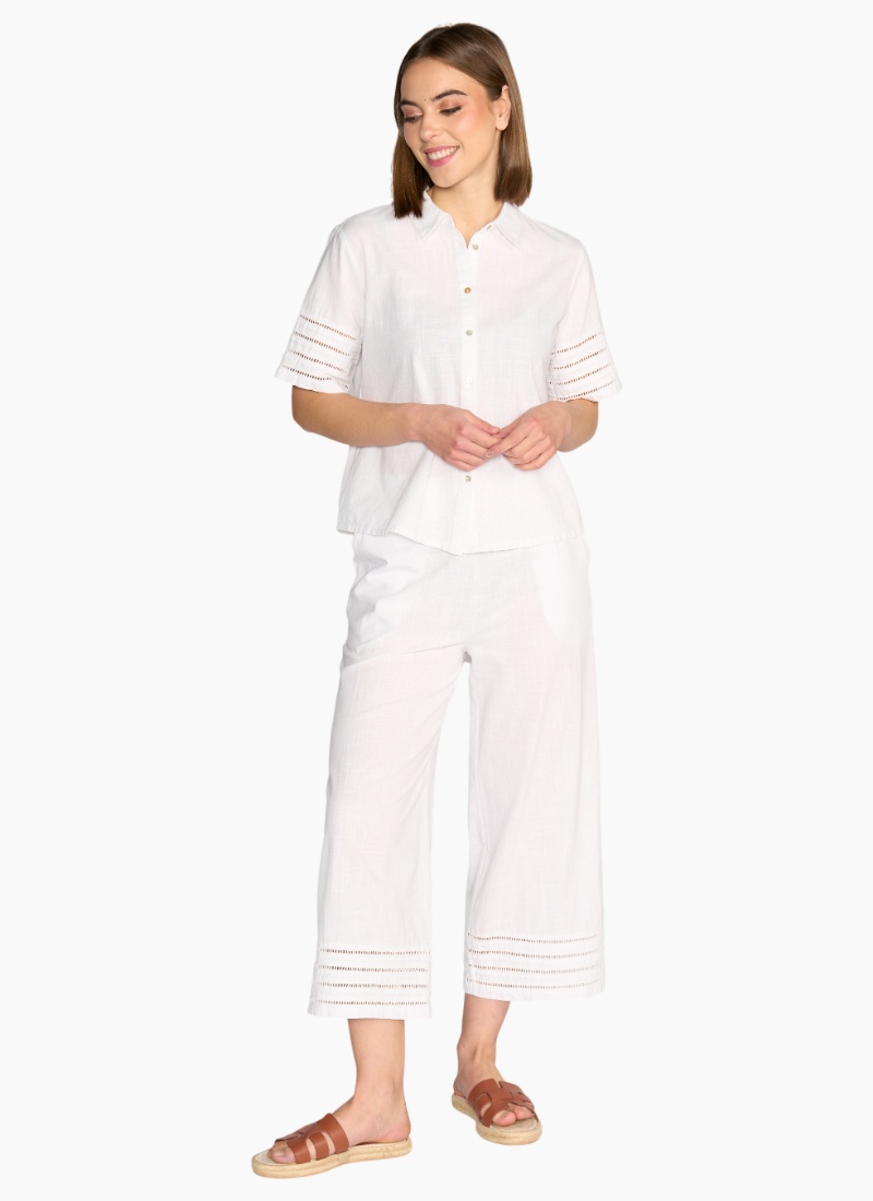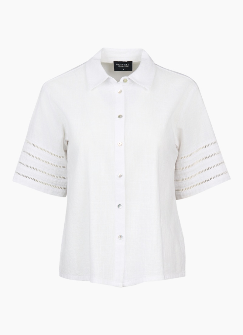 This short sleeve button-up shirt is made from lightweight 100% cotton with a soft, linen-look texture for an easy, relaxed feel. Featuring holed trim detailing around the sleeves, it's perfect for a laid-back summer look• Shirt collar • Button-up style with mother of pearl buttons • Short sleeves with trim detail at base of sleeve • Relaxed fit • Model wears size 10