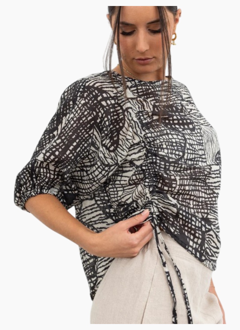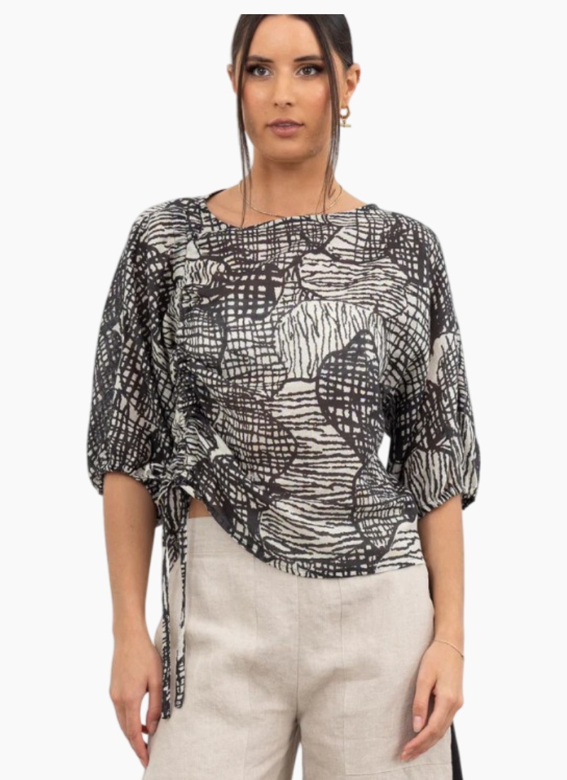 The Pixelated Pattern Top is a bold, art-inspired piece that brings texture and movement to your wardrobe. The relaxed silhouette is elevated with a side drawstring detail that allows you to create soft ruching and adjust the shape to suit your style. Half-length sleeves with subtle volume add a touch of drama, making it perfect to pair with tailored linen trousers or casual denim for an effortlessly chic look. Or team up with matching skirt for a formal occasion.