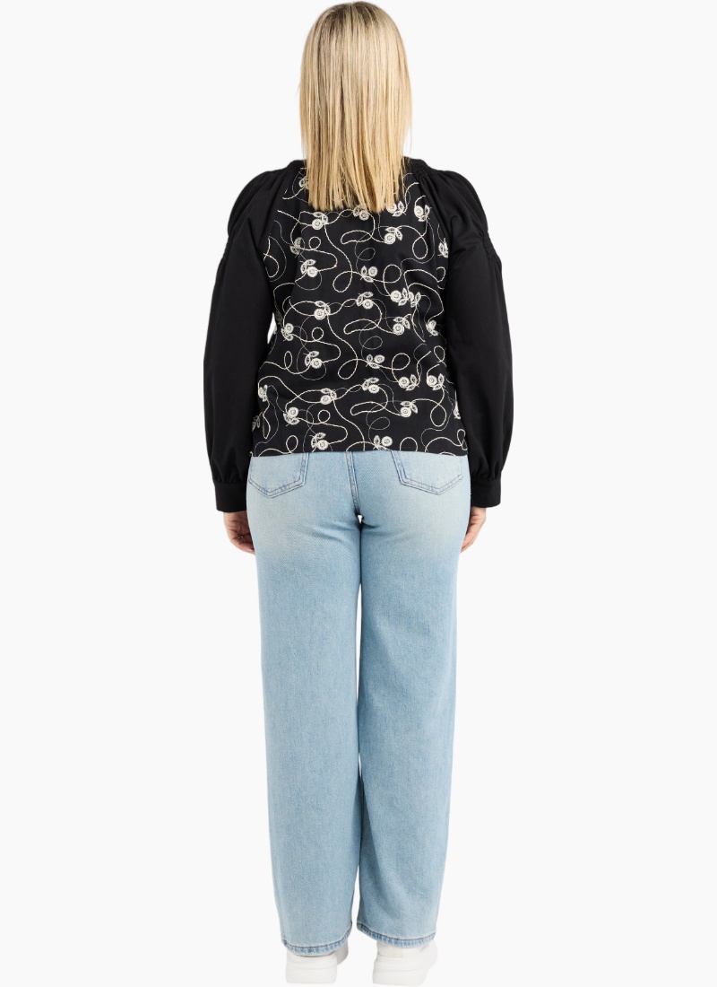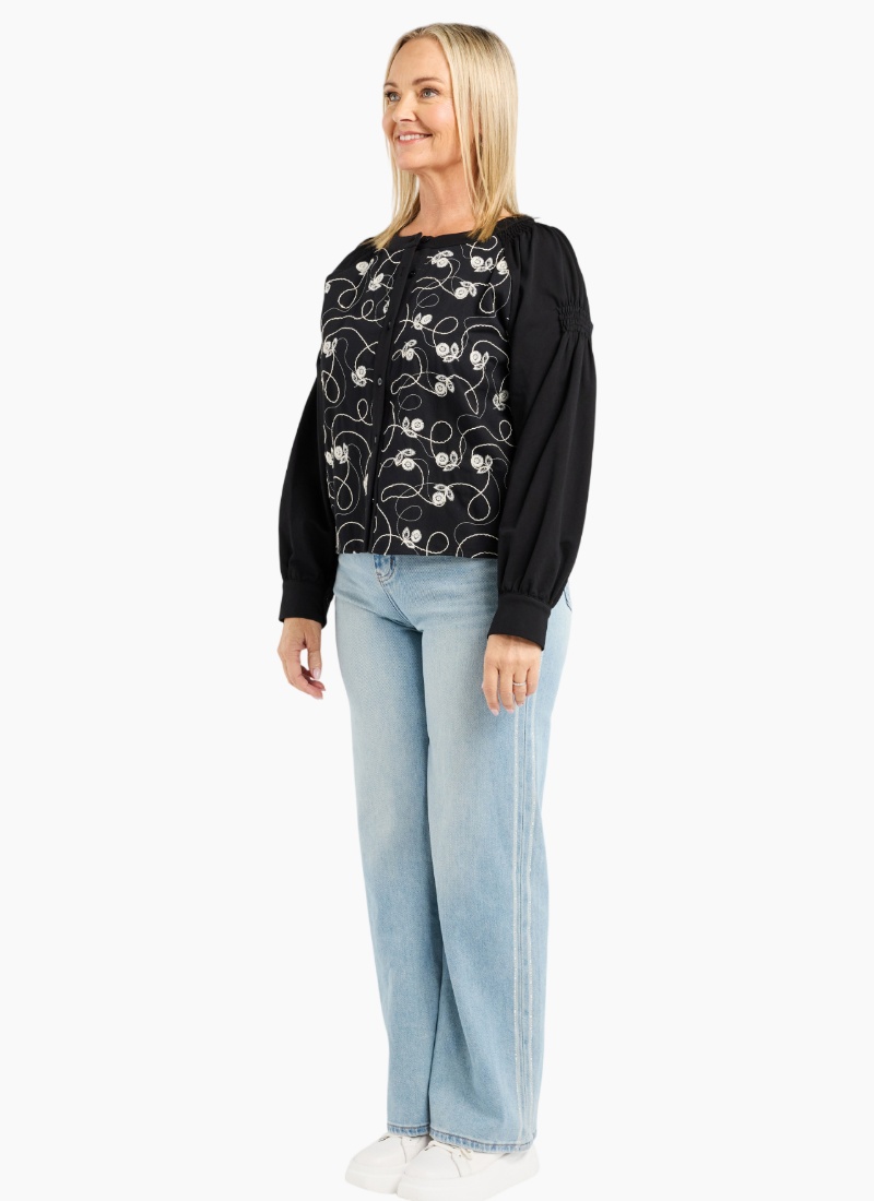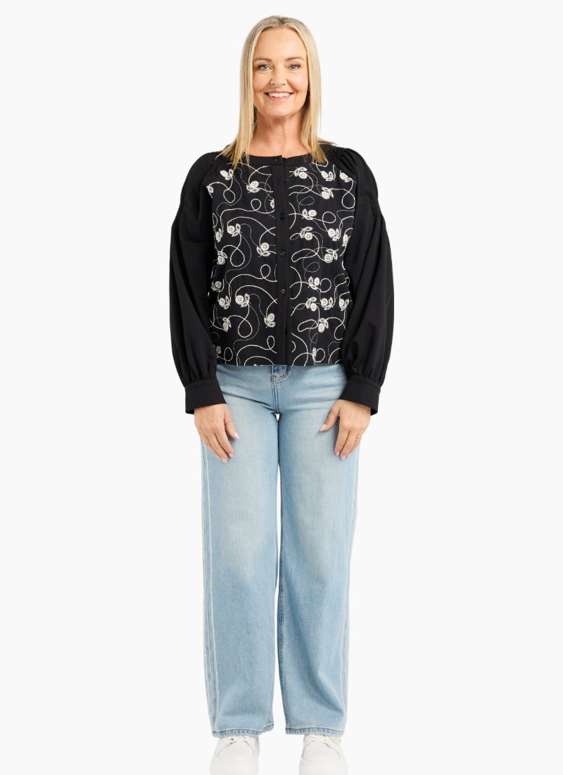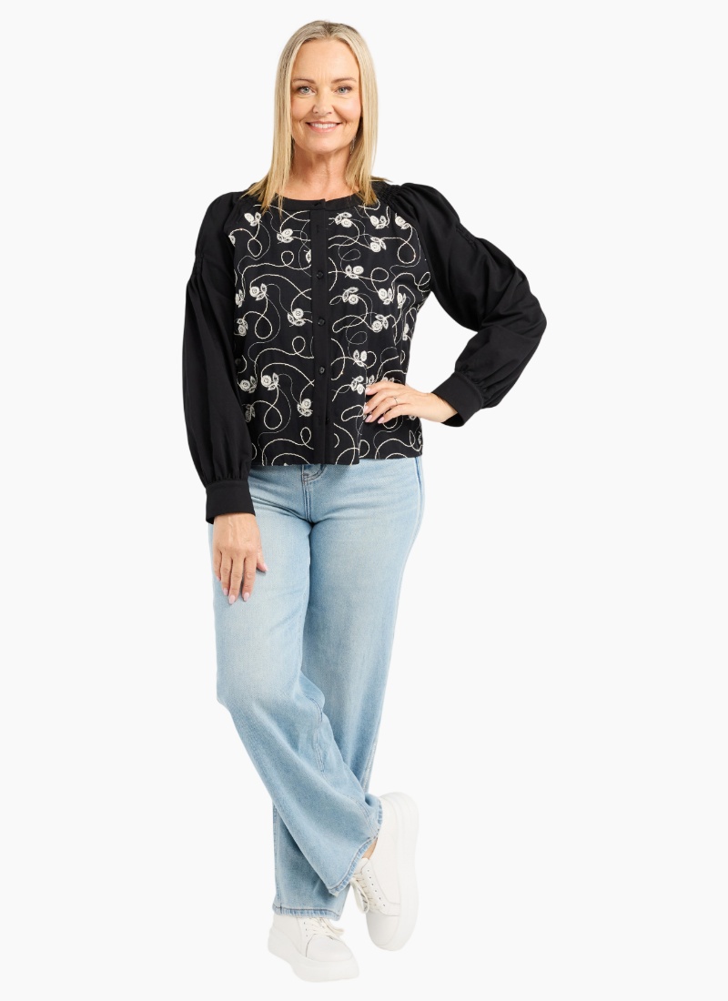 Timeless, meet Texture. The Alina Top by Zafina is the piece your wardrobe has been waiting for. Featuring stunning floral stitching across the front, this top balances a structured look with the softness of ruched, voluminous sleeves. Why you’ll love it: Two-in-One Versatility: Heavy enough to be worn as a chic cropped jacket or a classic button-down top. Artisanal Detail: Intricate "Flower Thread" embroidery with a delicate scatter of tiny gold sequins on the bodice. Flattering Silhouette: Round neckline and elegant cuffed sleeves..