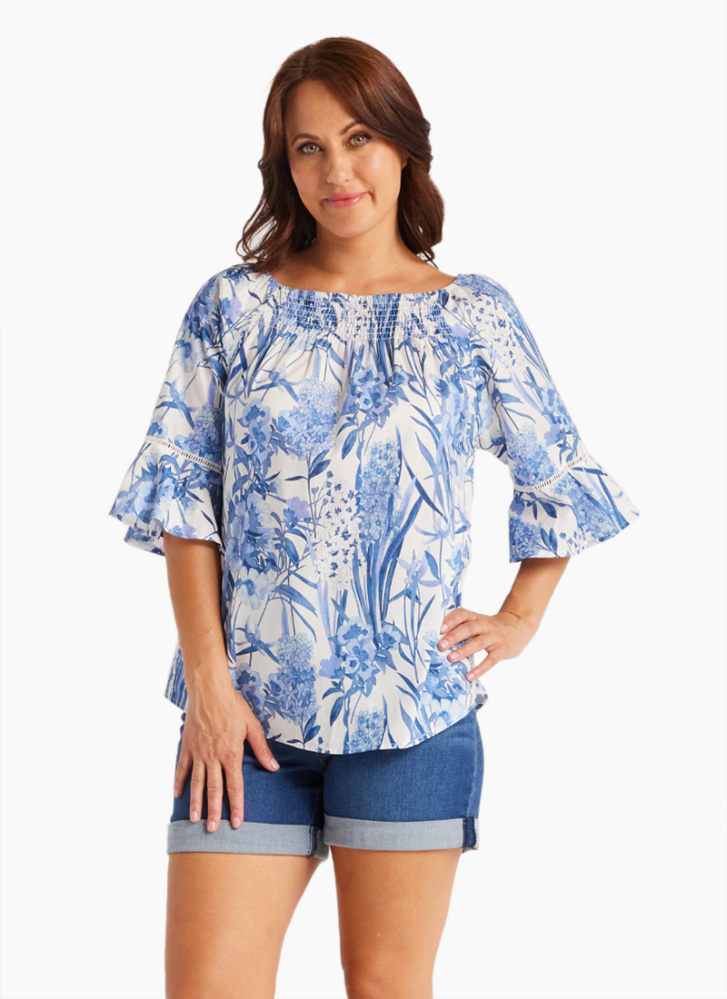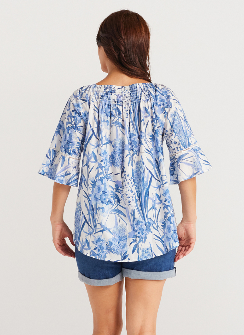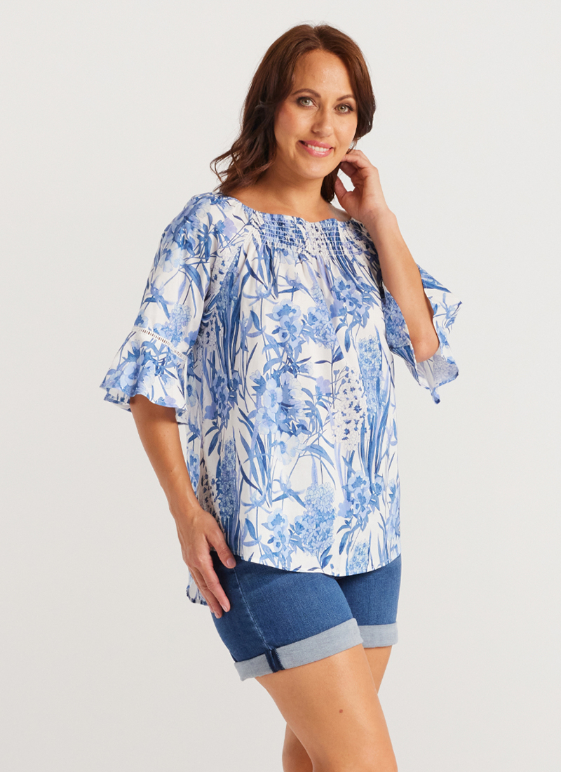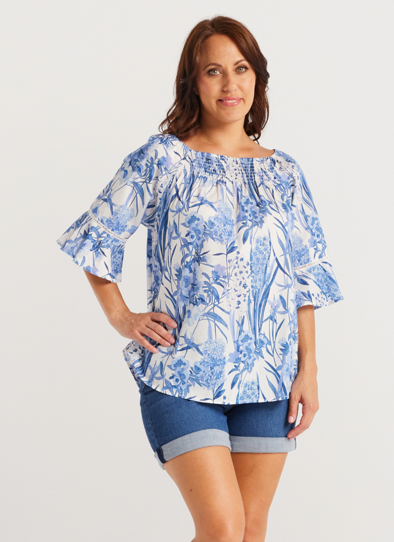 This 3/4 sleeve top showcases lace detail and a frill cuff, a wide scooped neckline with shirring, and a rounded hem.