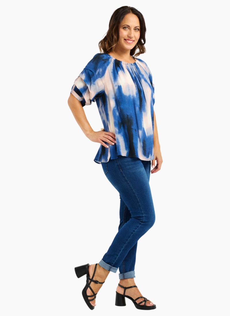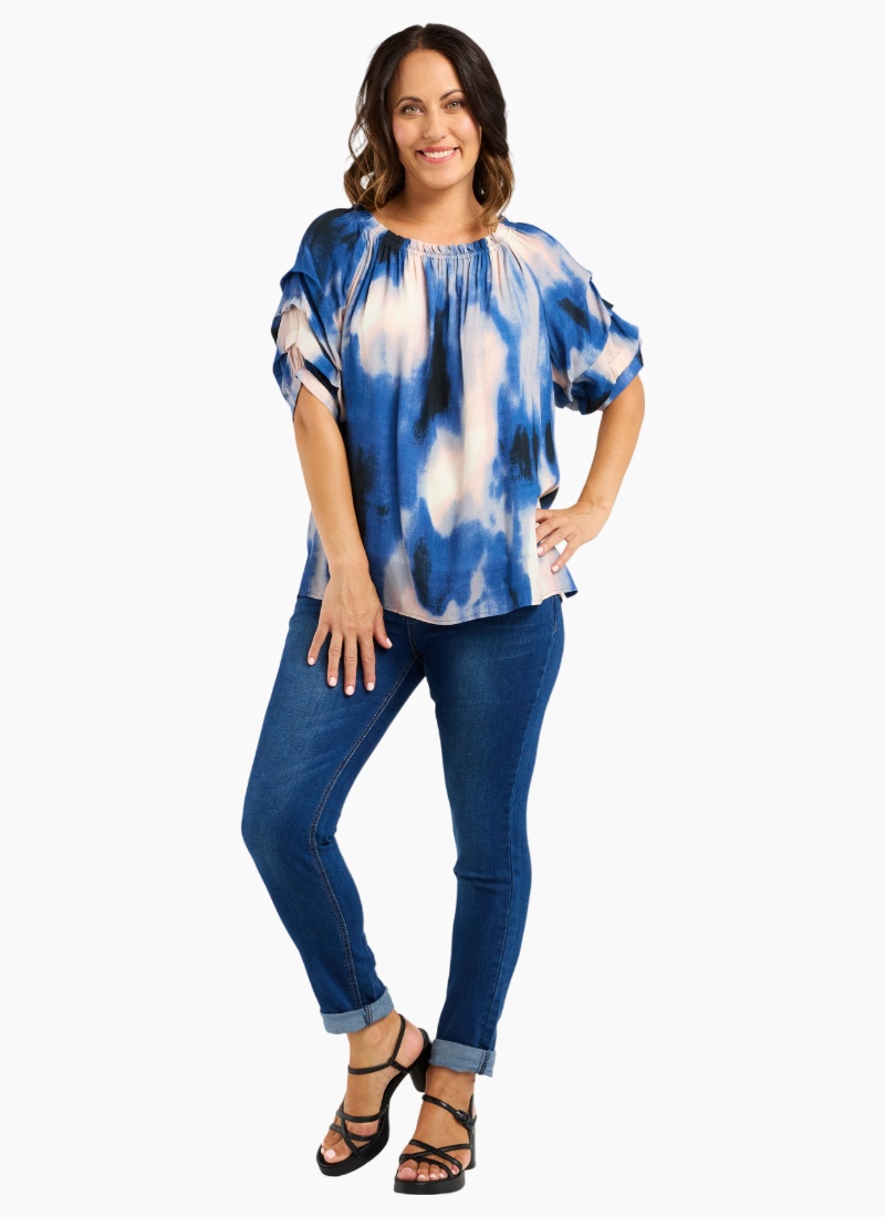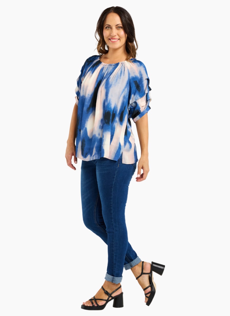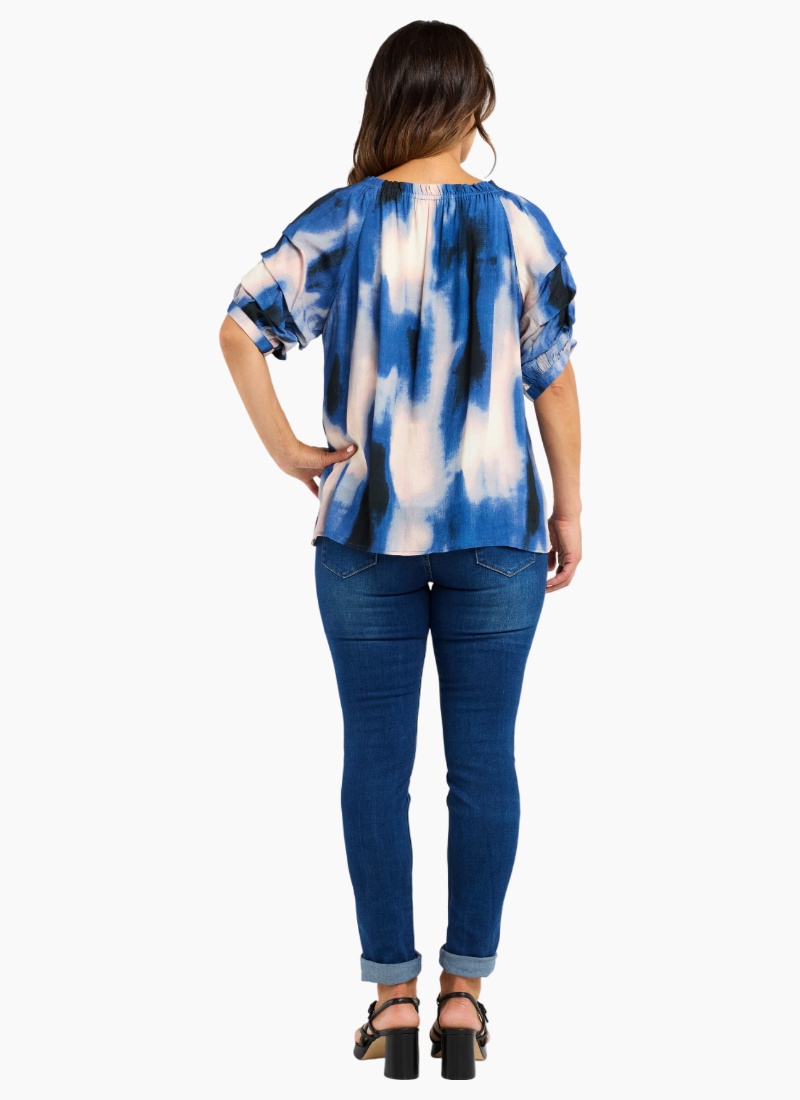 This top features a round neckline and gathered short sleeves for added volume, crafted from a beautifully printed fabric for a refined and polished look.50% Viscose 50% Rayon