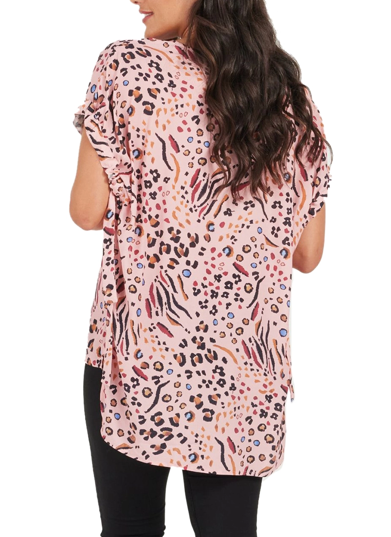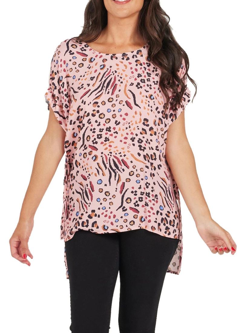 Classic round neck, short sleeve with drop finished with gathering around sleeve hem. High/Low hemline.