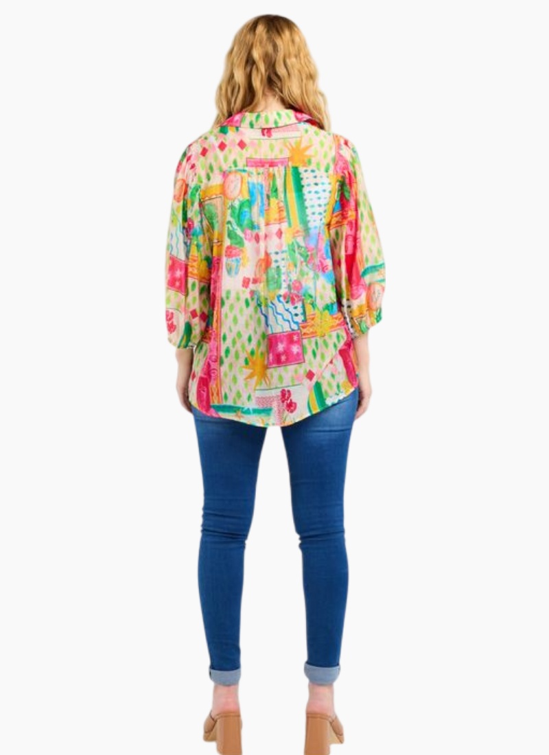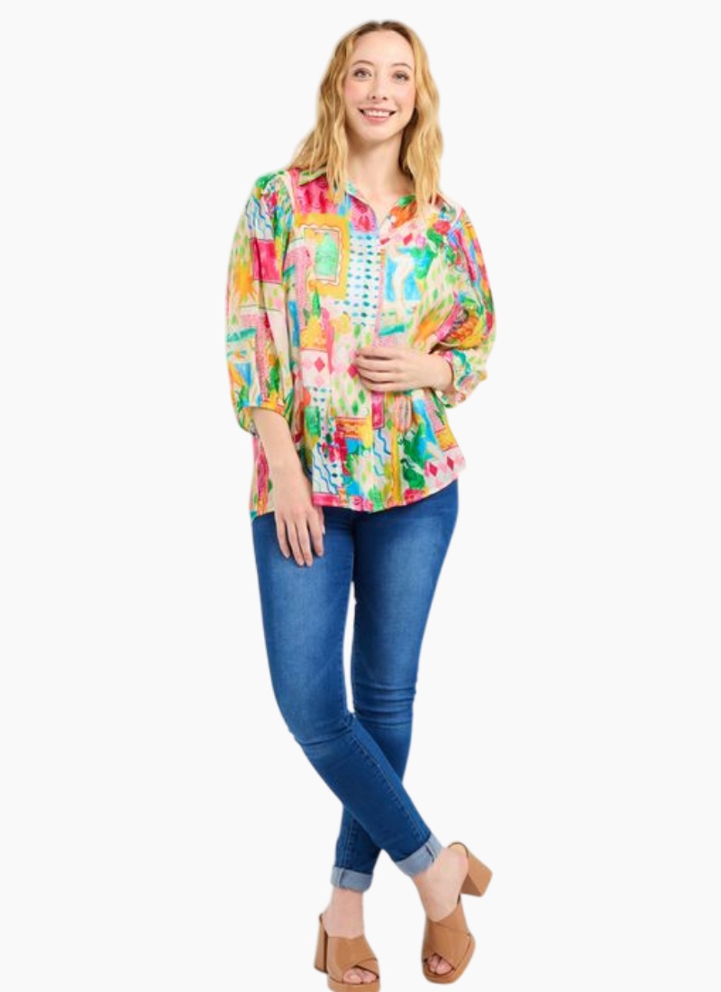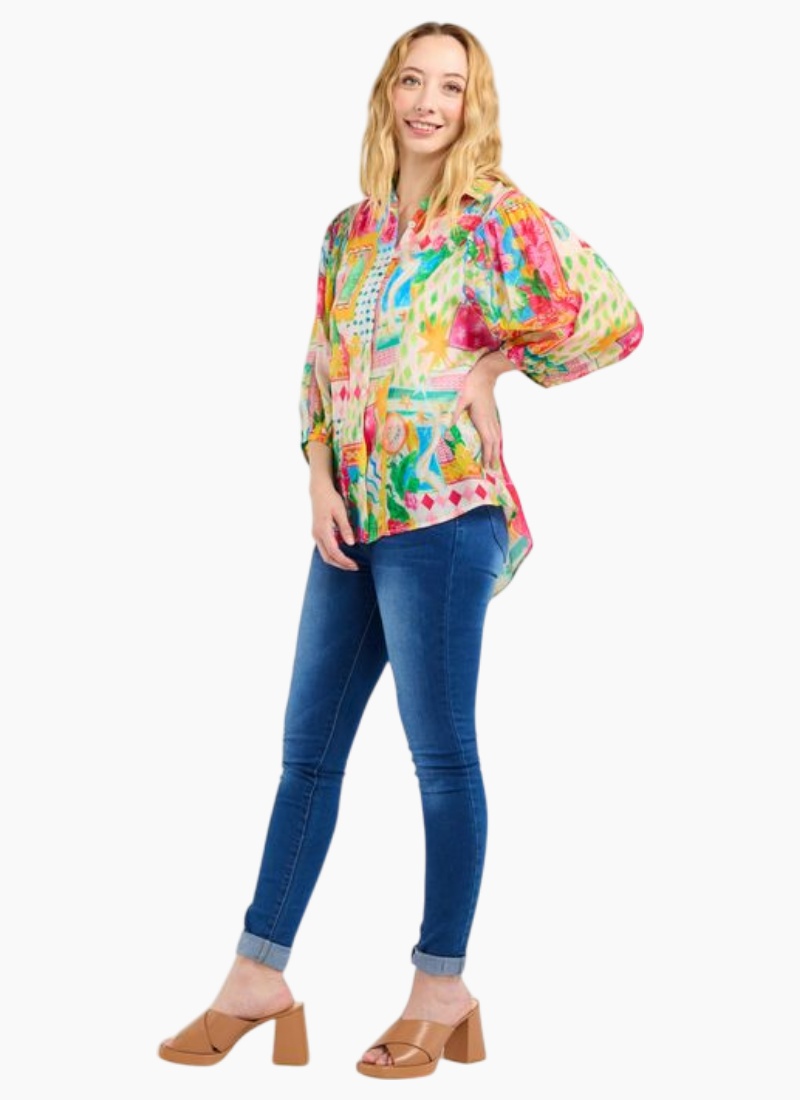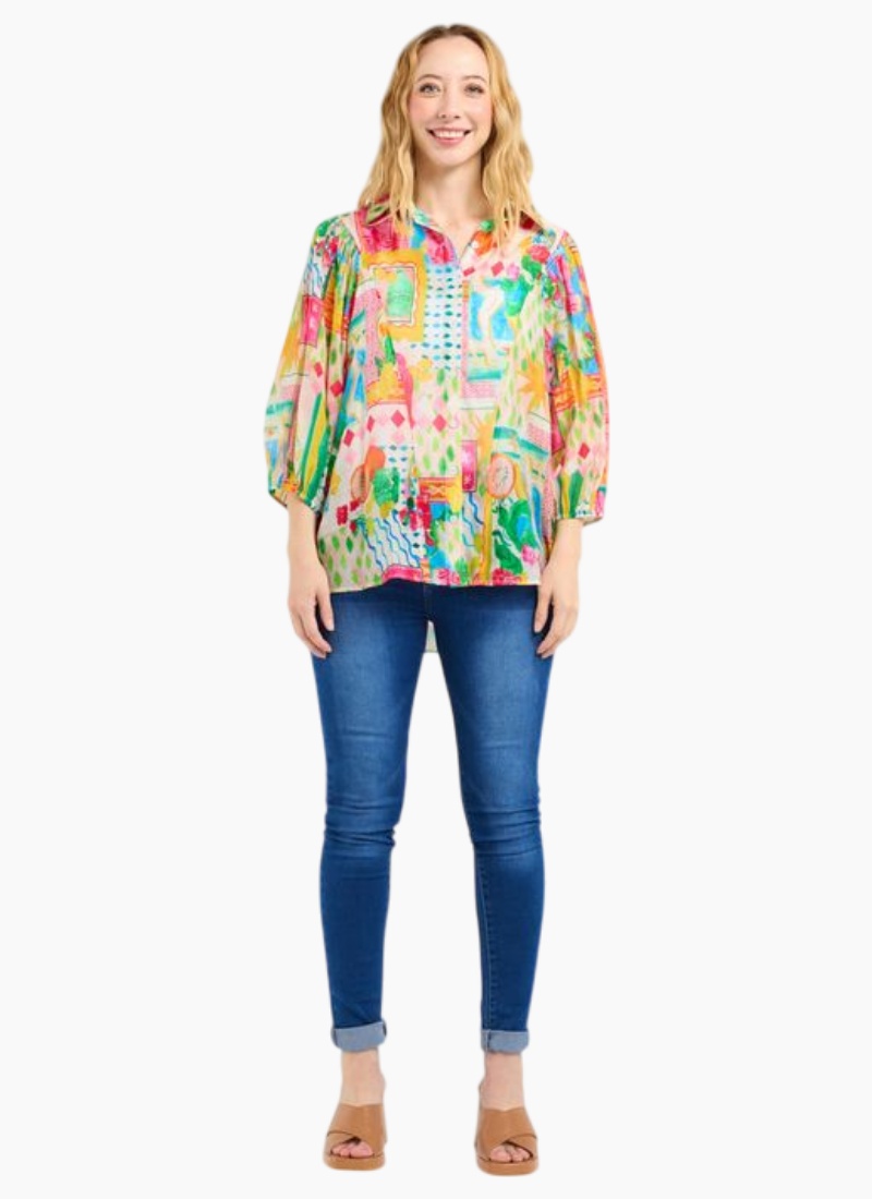 Introducing the vibrant EMILY SHIRT from Zafina. This eye-catching piece is perfect for adding a splash of colour to your wardrobe.This shirt features a bold-look colourful fabric with a button-down collar neckline and elasticated puff sleeves that reach the elbow, combining classic charm with a touch of modern comfort.