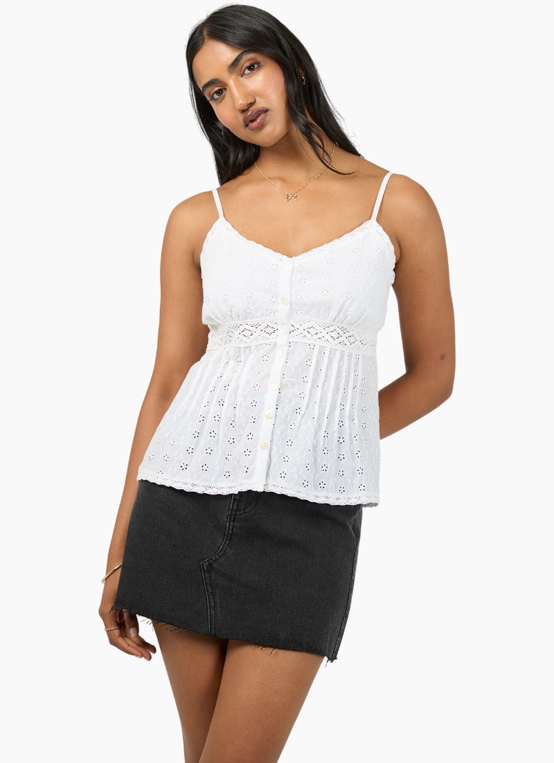 Introducing the Winslet Top from All About Eve. A delicate white cami crafted in eyelet cotton for an airy, romantic finish.