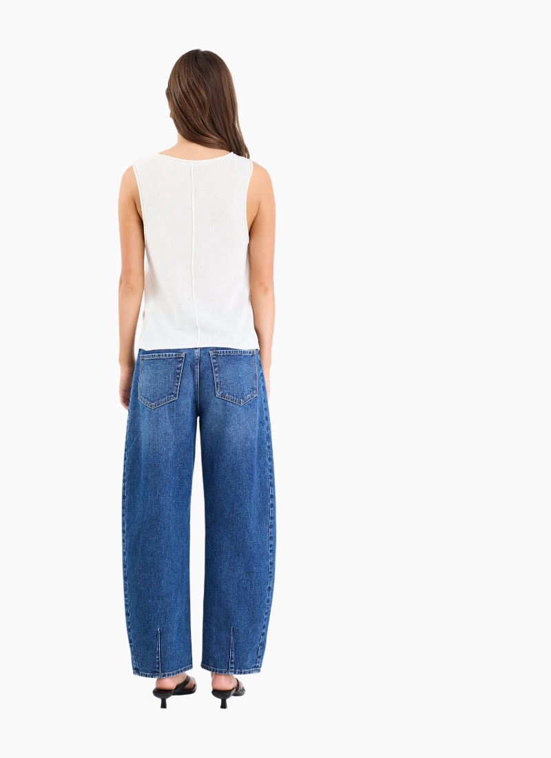 - Sleeveless silhouette with a neat rounded neckline and subtle centre-back seam for quiet tailoring detail